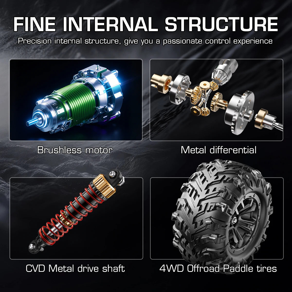 【Durable Construction】 Built for durability, our car features a high-strength composite honeycomb chassis and full-metal CVD integration for maximum rigidity. Metal spur gears and a differential with metal bearings ensure smooth power delivery, while front and rear independent suspension provide a smooth ride over rough terrain.