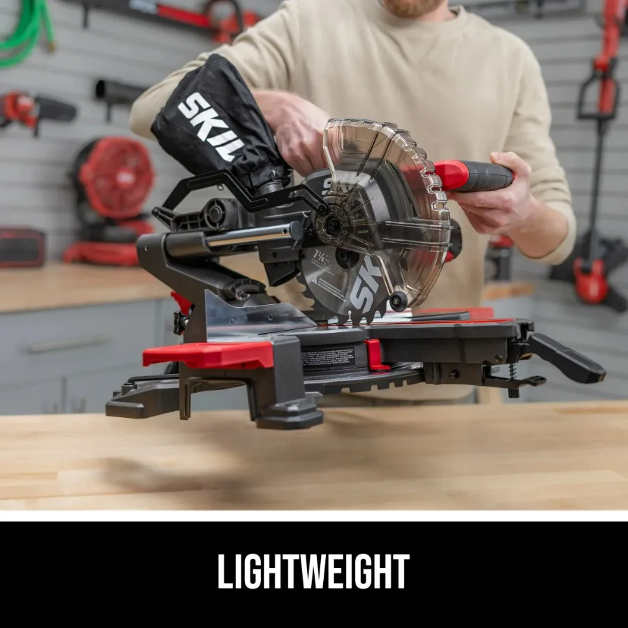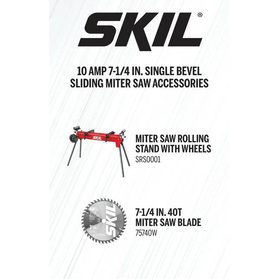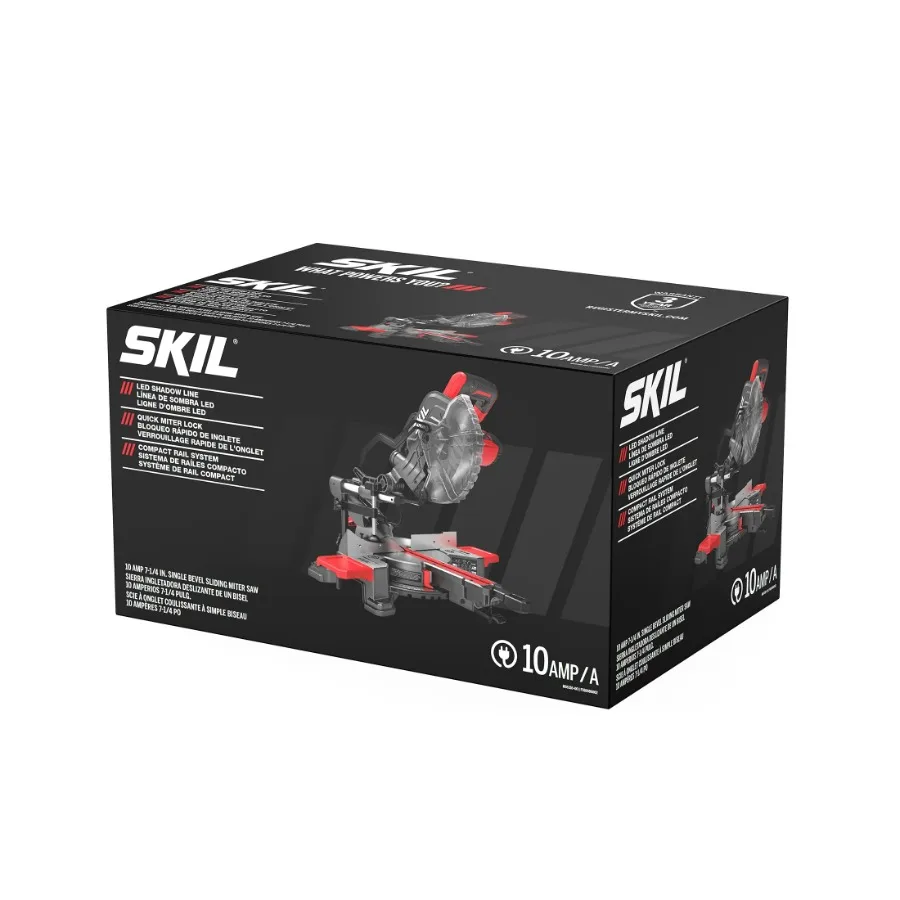 Make exacting cuts for baseboards, casing, and crown moulding, or cut planks for shelves and bookcases using the SKIL 10 Amp 7-1/4 In. Single Bevel Sliding Miter Saw. The miter saw features an LED shadow line that delivers cuts with greater accuracy than lasers. Its quick miter lock delivers quick and accurate miter angle adjustments while its 10-amp motor powers up to 4,800 RPM for fast, detailed cuts. This single bevel miter saw features a lightweight design for easy transport and storage with a compact rail system that minimizes the saw’s footprint for flush cutting against walls. Its single bevel allows cuts from 0 to 45 degrees left while its work clamp secures materials for safer cutting. The miter saw comes with a dust bag, double-ended Allen wrench, work clamp, and 7-1/4-inch 24T carbide blade.