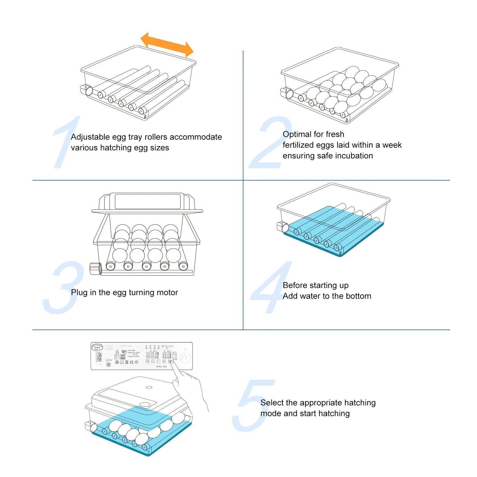 Incubation steps: 6-16 incubators only the temperature display more than 24 incubators have temperature and humidity display and chicken, duck, and constant temperature mode can be freely adjusted mode.