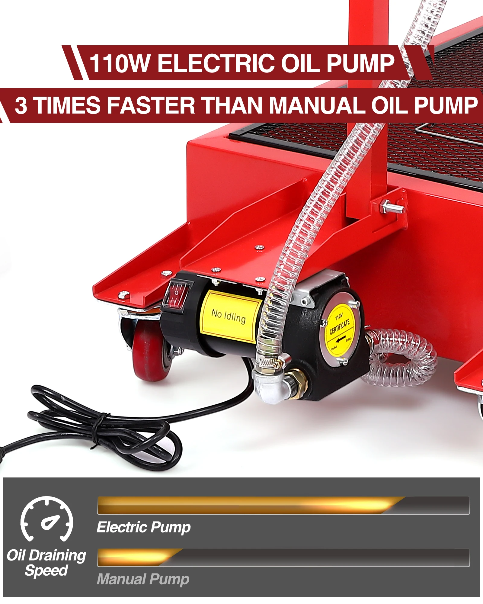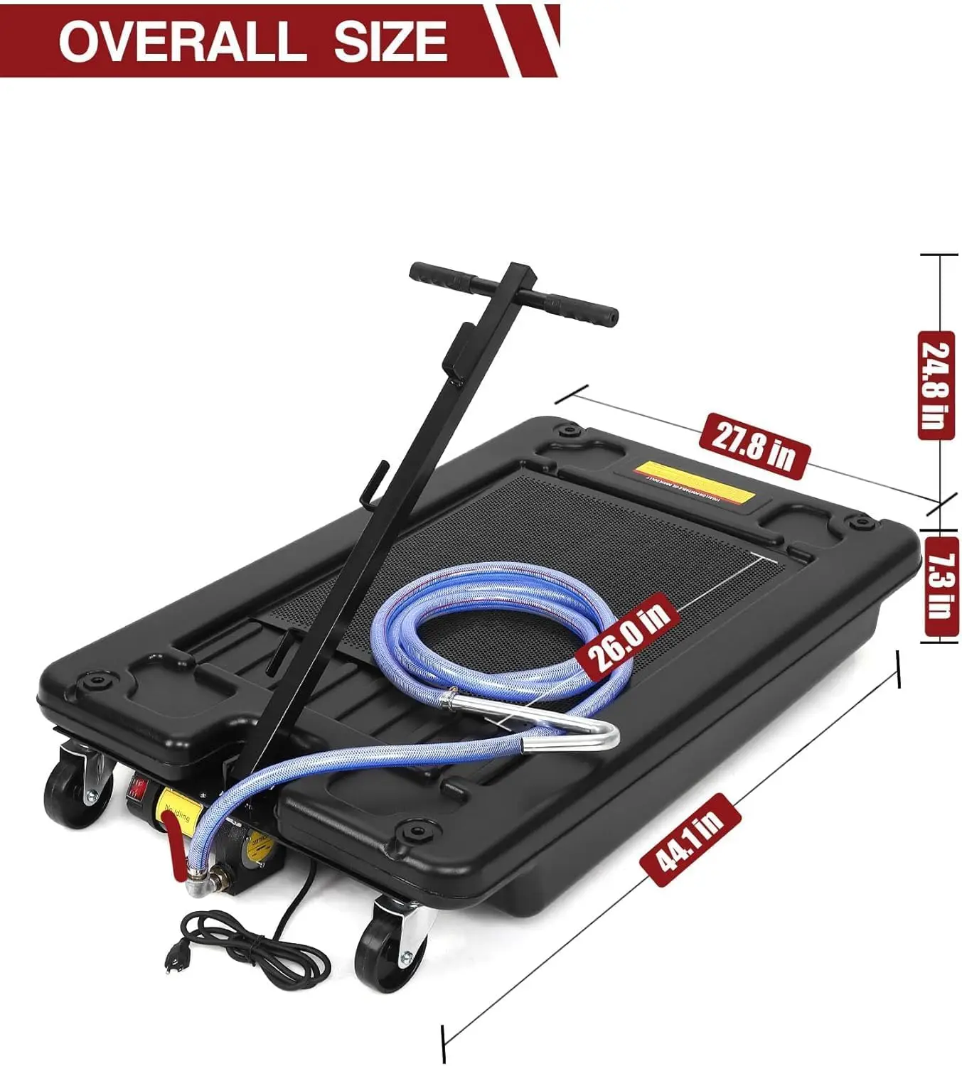 Oil Drain with Pump: Our oil drain pan has a manual rotary pump installed under the front of the oil tank, which can quickly drain the oil, coolant and other fluids. We provide a 7.2-foot exhaust hose for easy draining.