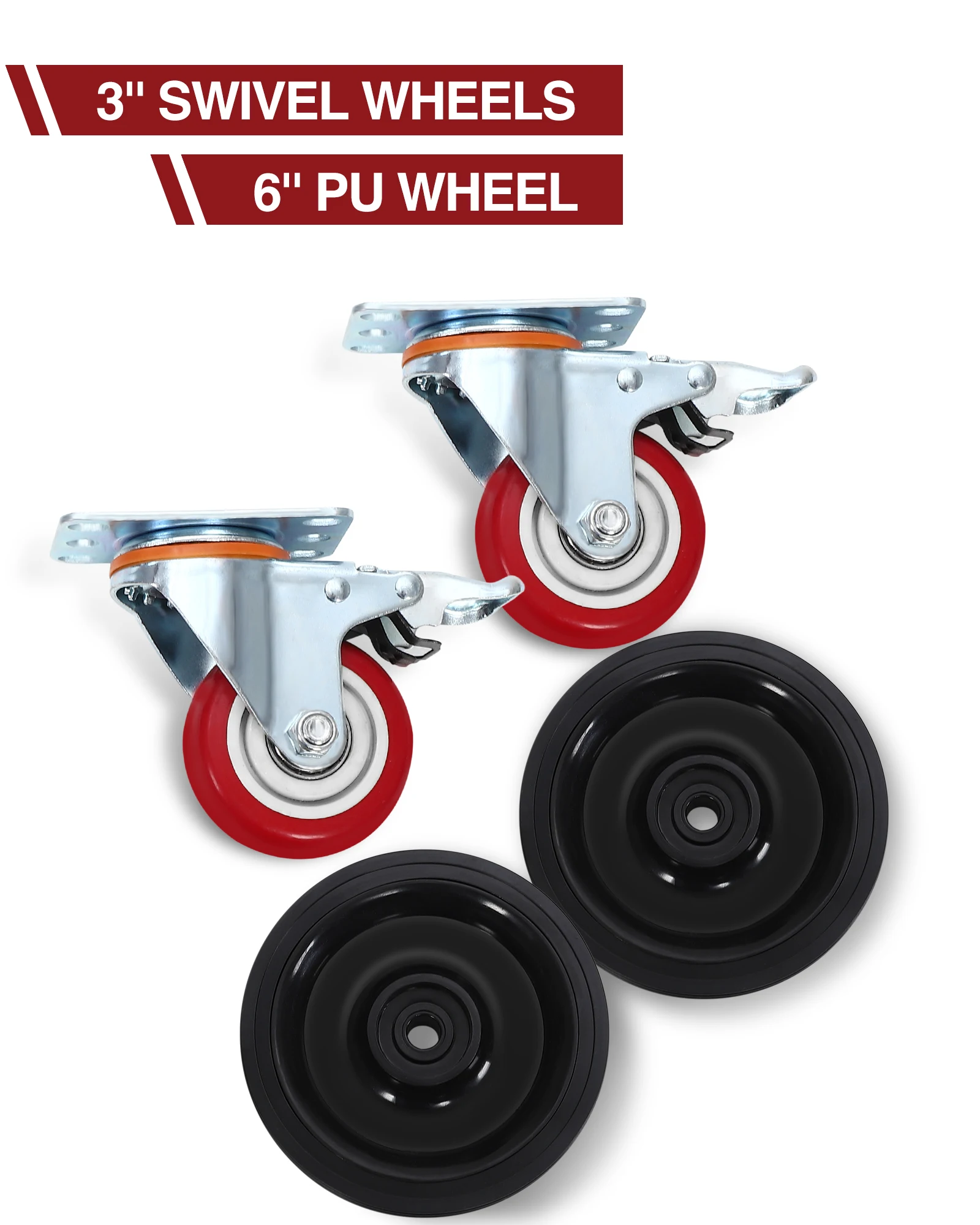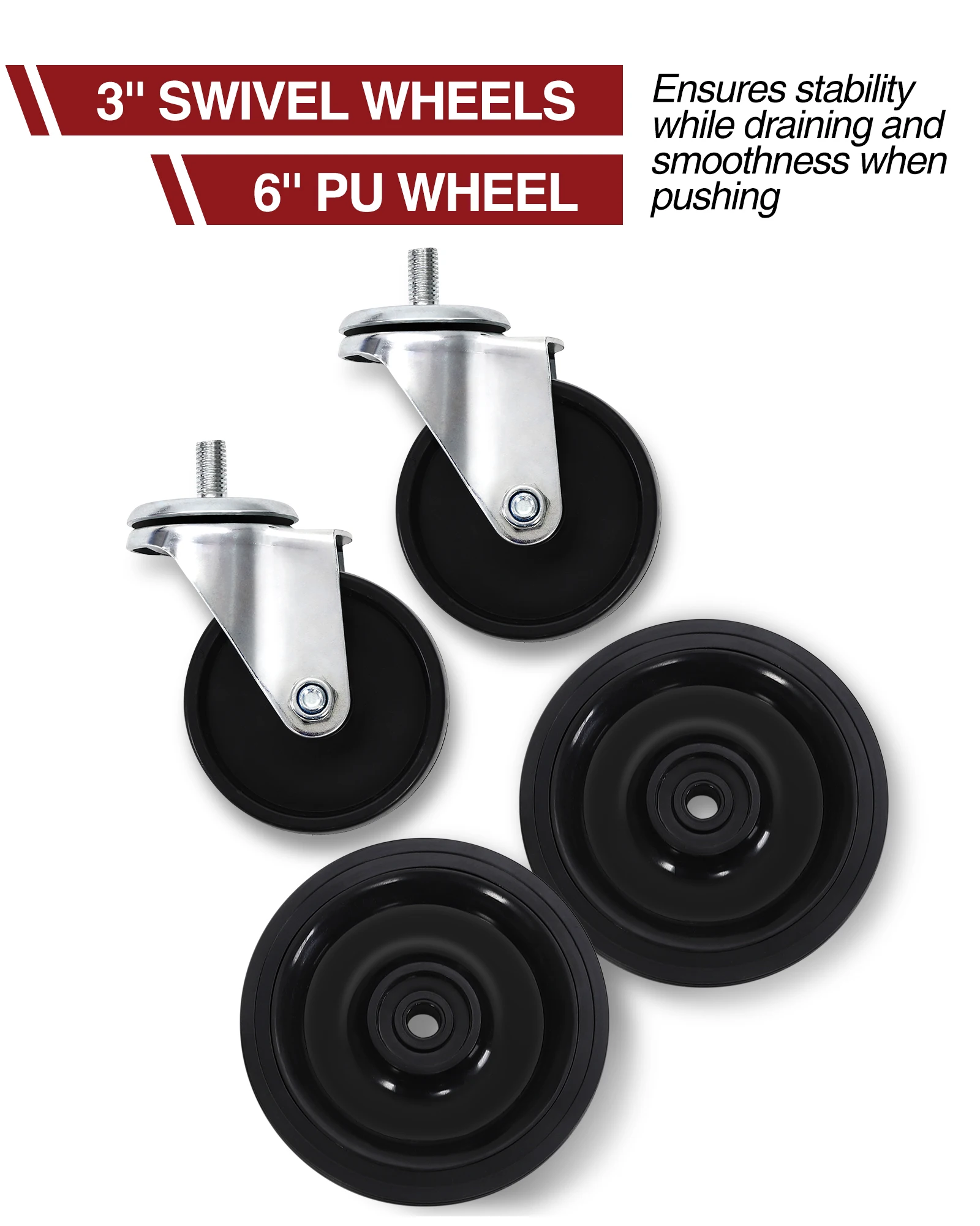 Heavy Duty Casters: Our oil drain pan is constructed with two 6-inch wheels and two 3-inch swivel casters for smooth operation and mobility. The swivel casters are equipped with brakes for safe parking.