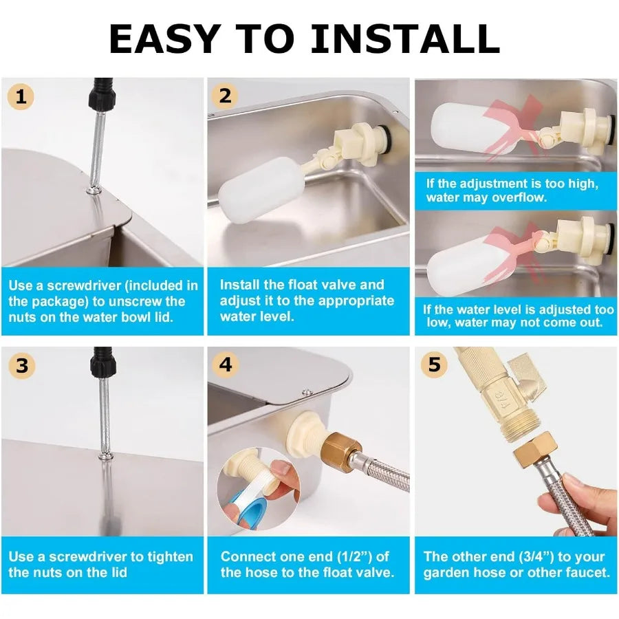 Note: To prevent the float valve from breaking during shipping, the float is not pre-installed in the water bowl; when you receive the package, you need to use a screwdriver (included) to open the lid to install the float valve in the bowl