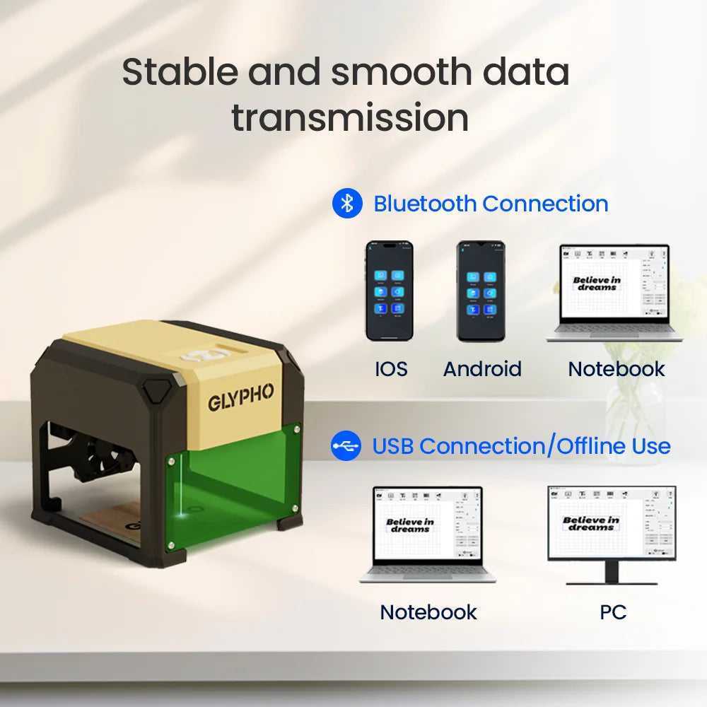 5. Three connection modes:Bluetooth connection (easy to operate on the app page), computer operation (diverse creation of pictures and text), offline engraving (cloud storage and memory function, please external connection, one-key repeat engraving), the engraving machine matches professional applications. transmission is 5 times faster