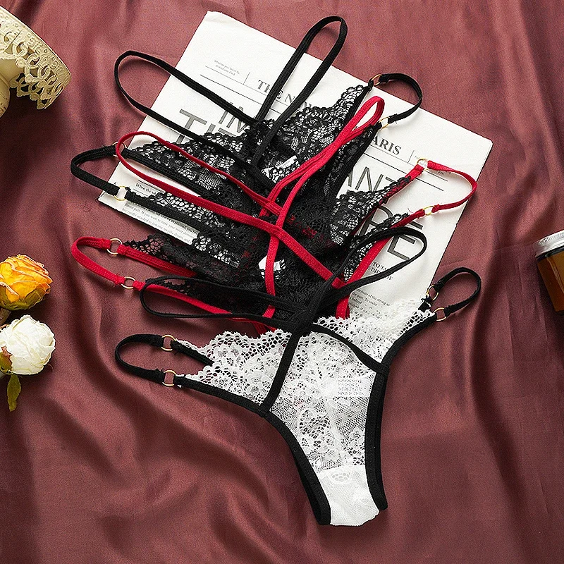 3PCS Women's Sexy Lace Strap Briefs Thin Cross-Color Hollow Transparent French Underwear Sweet Bow Breathable Low-Rise Panties