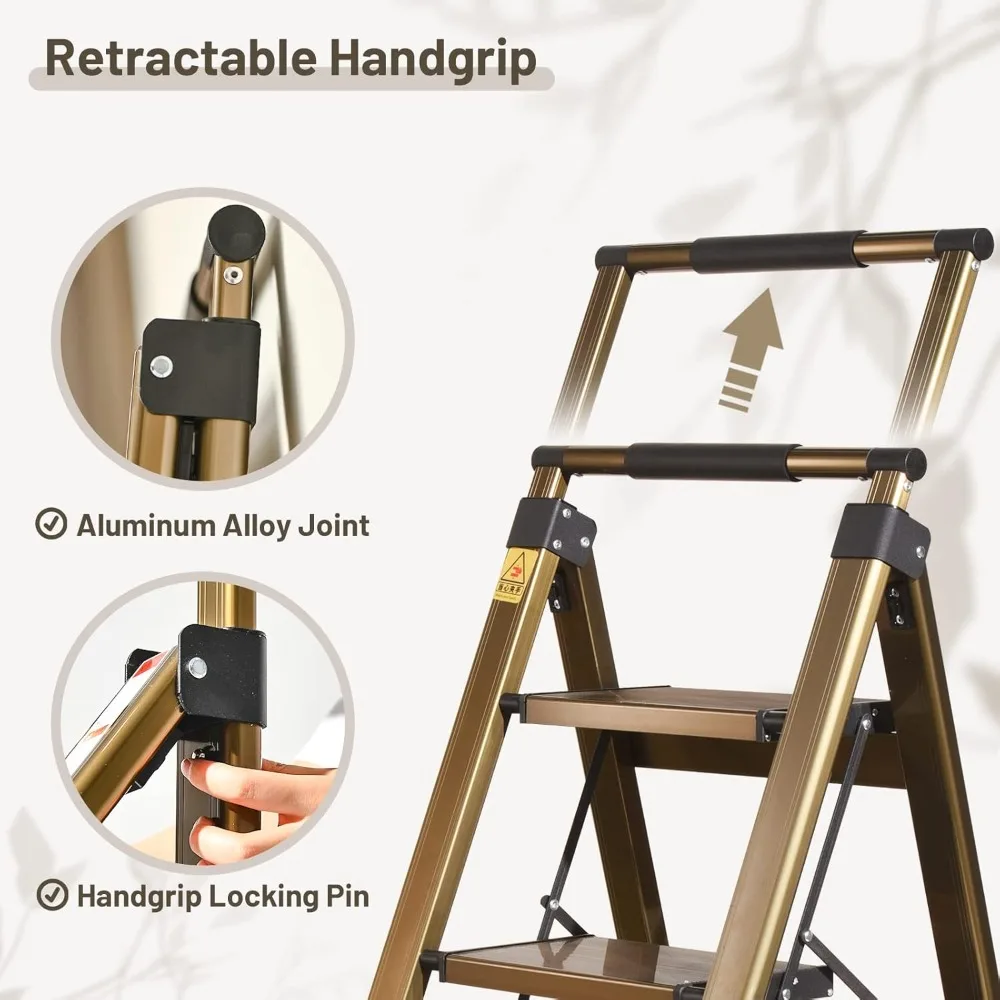 - RETRACTABLE HANDGRIP : Aluminum 5 step ladder with retractable handgrip saves more storage space. Pull the handgrip up and lock into place, it can't go down until you fold the ladder. You can freely choose whether to pull out the handrail without affecting the working height.