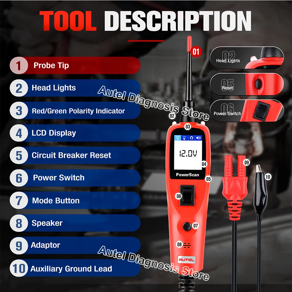 The PowerScan Tool is the most revolutionary circuit tester to date. Featuring AVOmeter, test light, built-in flashlight, short circuit indicator, relay/component tester, continuity tester and bad ground indicator, the PowerScan is truly the ultimate in power and affordability, allowing users to check circuitry in one single step. An absolute must for every technician looking for a fast and accurate solution to electrical system diagnostics.
