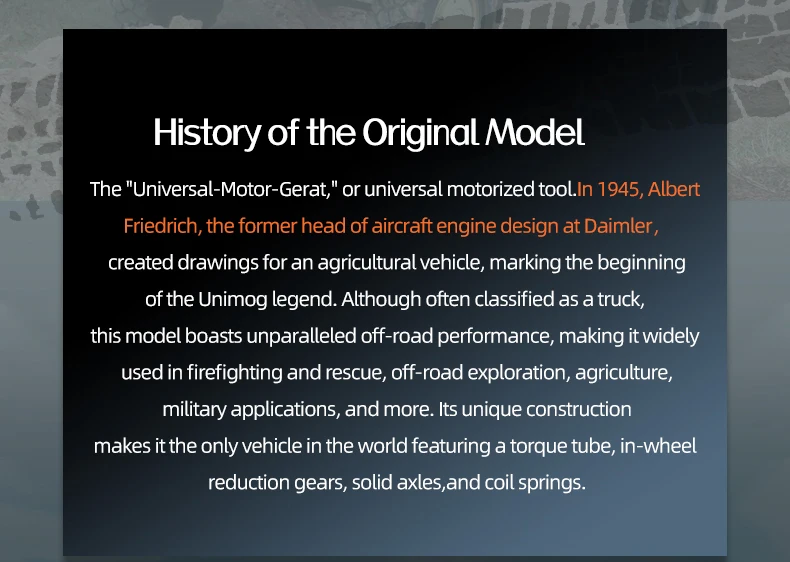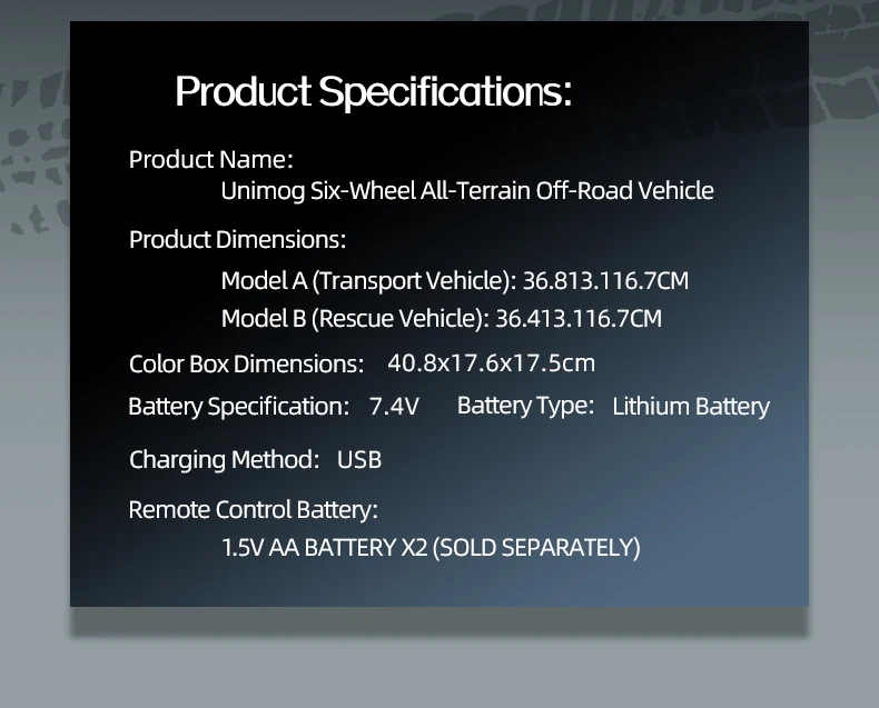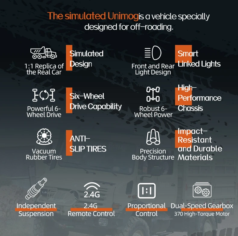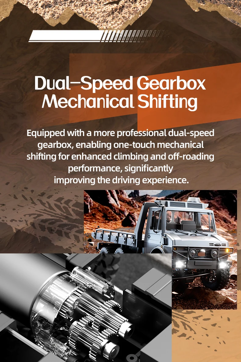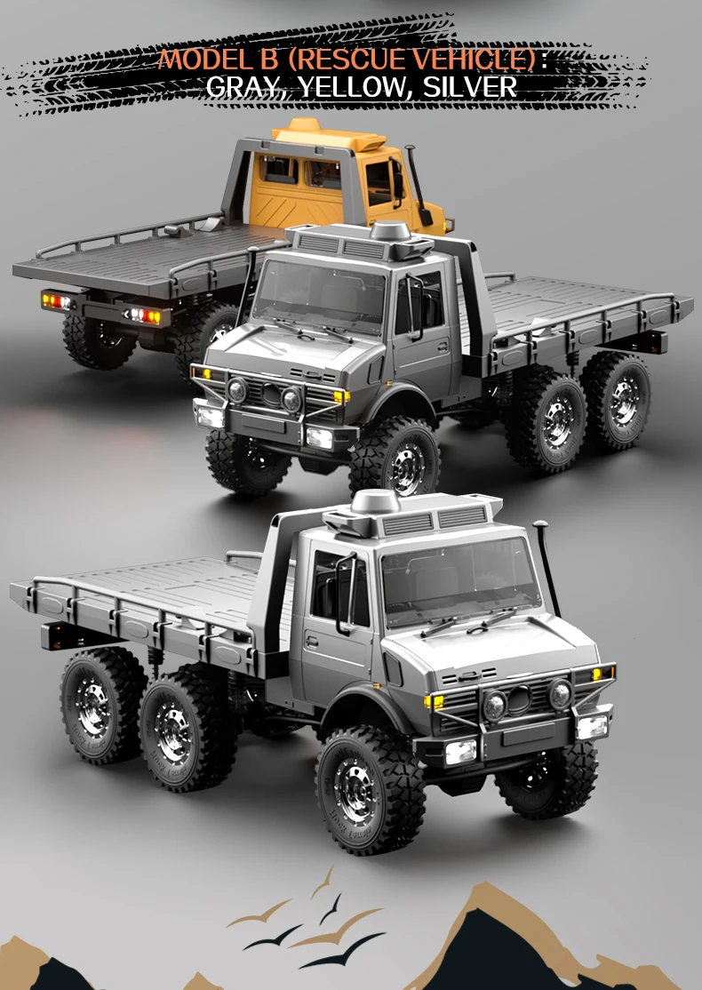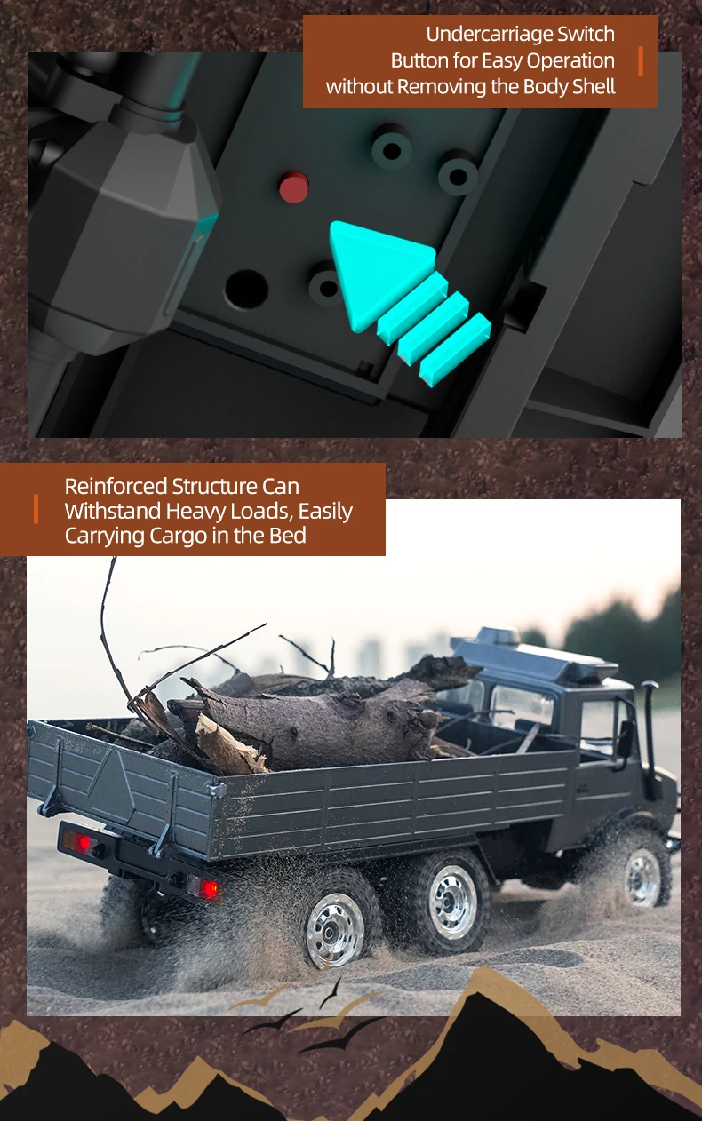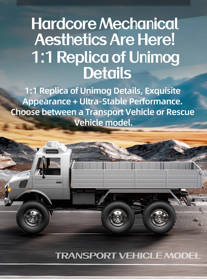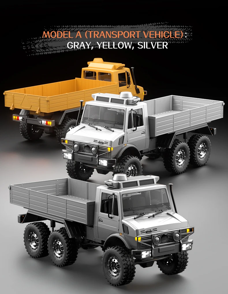 The 1:18 six-wheel drive remote control model continues the Unimog simulation model in terms of appearance details. The factory has launched two models: military transport vehicle and civilian rescue vehicle. The new body structure adopts the design of placing the battery in the front of the car, which is convenient for battery replacement, and can also lower the center of gravity and improve climbing performance. The gearbox uses high and low speed gears. The power adopts a high-torque black leather motor and a high-rate power battery. The 20A waterproof brushless electric regulator enables the car to burst out with strong output force, low linear posture, and can run and climb. The chassis has a high ground clearance, retro truck tires, and a widened integrated bridge, which increases the stability of the body and is more operational and off-road capable.