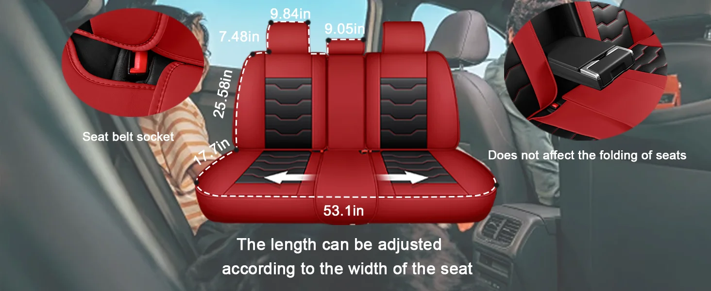 ● Adjustable 3-Piece Rear Bench Cover: The rear seat cover comes in a versatile three-piece set. Its width is adjustable between 48 and 58 inches, ensuring a custom fit for various car models. The middle piece of the backrest is flexible and removable, making it compatible with vehicles featuring a rear center armrest.