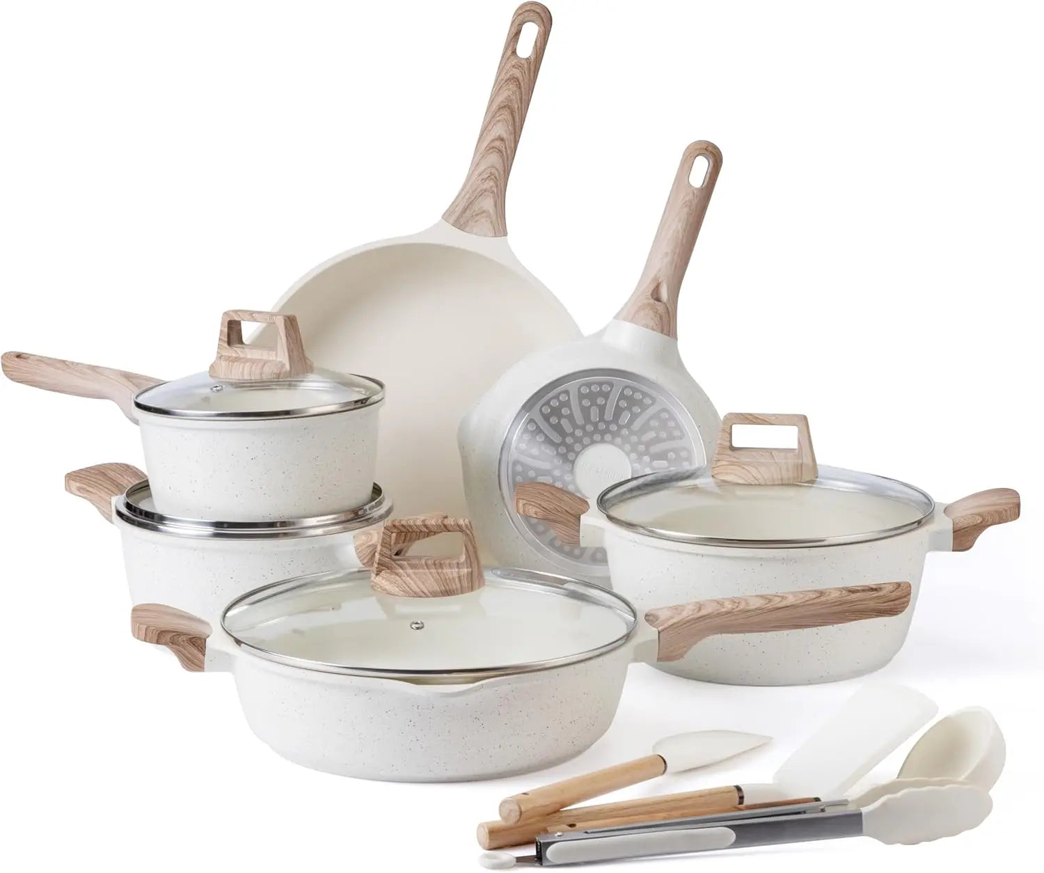 - Complete 14-piece setup includes 3 qt and 4 qt casseroles with glass lids, a steamer, 11" and 8" frying pans, an 11" deep fry pan with lid, a 2 qt sauce pan with lid, and 4 silicone utensils; features speckled coating and woodlike handles.