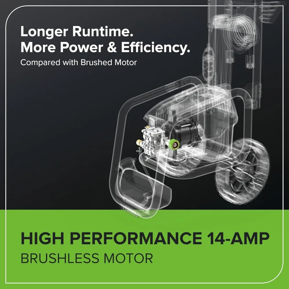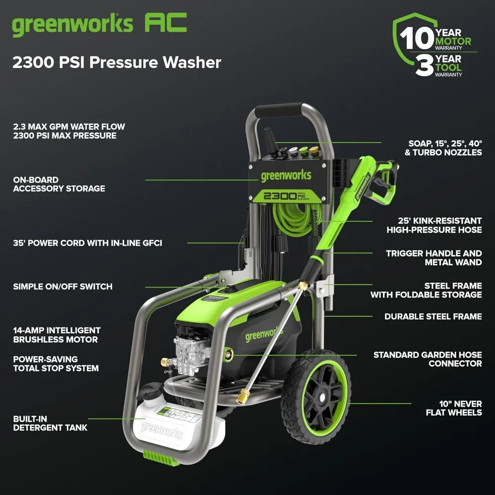 This item features advanced jet flow technology, capable of delivering a maximum pressure of 2300 PSI for efficient cleaning. It includes a rapid rinse function and a high flow rate, covering a larger area compared to standard models. The pump is of the axial cam type, and it comes with a single on-board soap tank. An onboard tool is also provided for added convenience. Equipped with a brushless motor, this product utilizes smart flow technology to sense water pressure, ensuring optimal pressure delivery. The technology helps in maintaining the perfect amount of pressure for various cleaning tasks. The item is designed with a 25-foot hose that resists kinks, along with a 35-foot power cord that includes an inline GFCI for safe use with exterior outlets. It is mounted on large 10-inch wheels for easy maneuverability. Complementing the main unit, a range of accessories is included. These consist of an easy-to-grip spray nozzle and a metal quick connect wand that comes with various nozzle options: 15°, 25°, 40°, soap, and turbo nozzles. This product is backed by a comprehensive warranty: a 3-year limited warranty for the tool and an impressive 10-year warranty for the brushless motor.