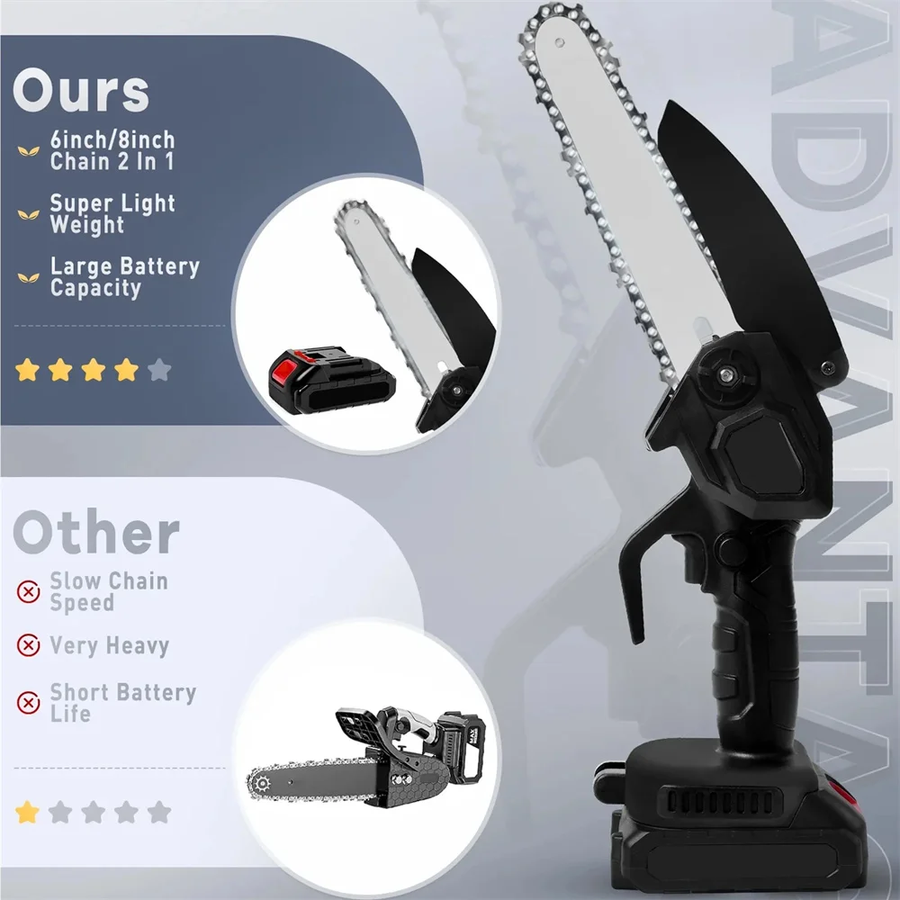 Our electric cordless chainsaw comes equipped with an 8" guide bar, which allows you to convert it between 6" and 8" power chainsaws as needed. So you can cut through stiffer and wider trees with ease. It is perfect for wood cutting, pruning trees and branches, cleaning stubborn bushes, gardening, deforestation, carpentry DIY, and more. -
