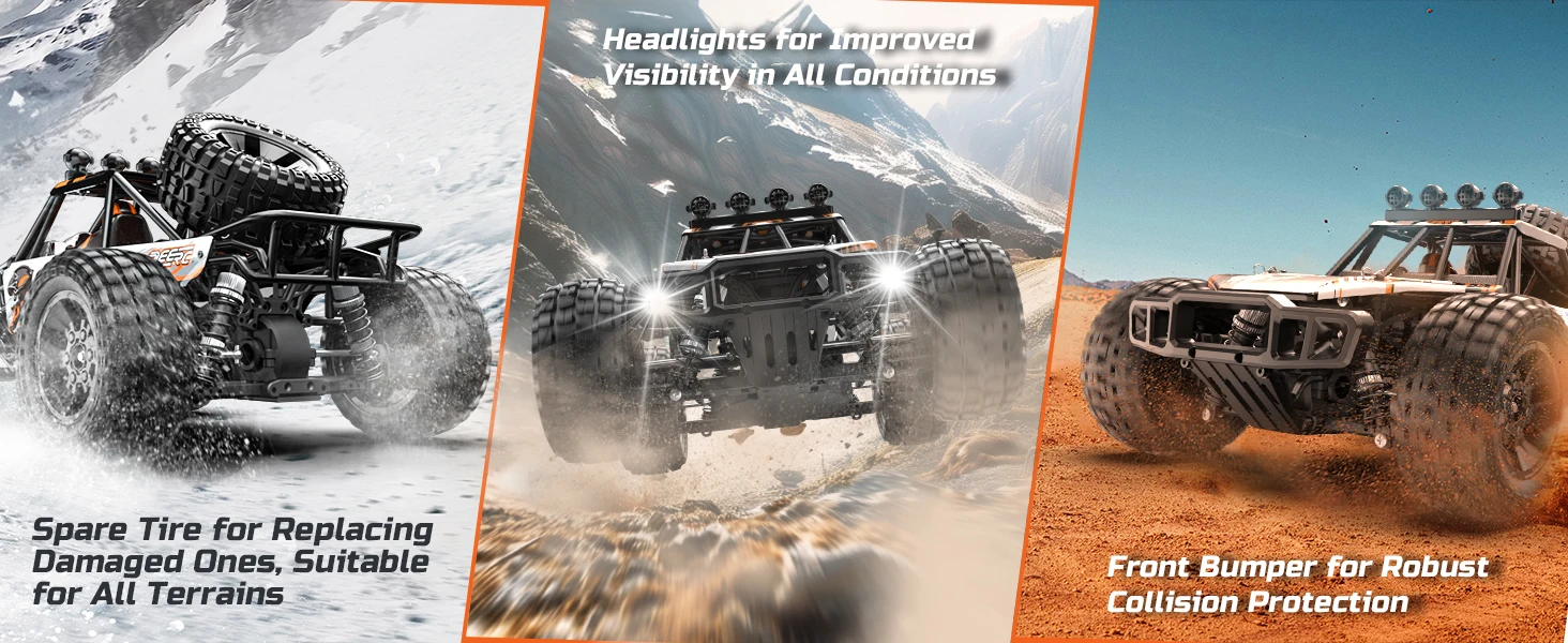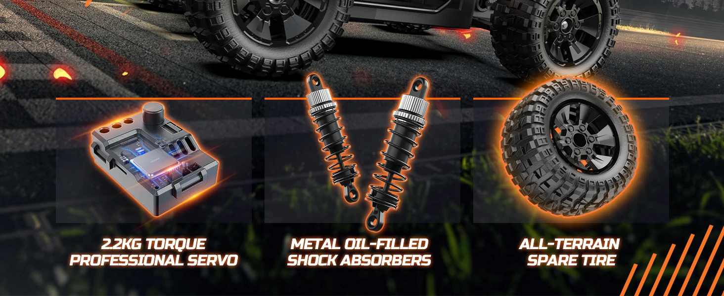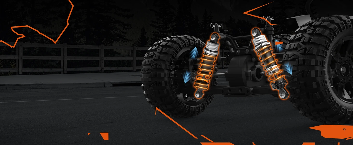 Action-Ready Monster Truck - This high-speed RC truck features independent suspension design for both the front and rear, equipped with metal oil-filled shocks to maintain vehicle stability. Paired with non-slip rubber tires, the aggressive tread pattern helps you tackle any terrain with ease. The truck also includes an extra spare tire for quick replacement of damaged ones. Say goodbye to chassis roll and get ready for unlimited off-road adventures!