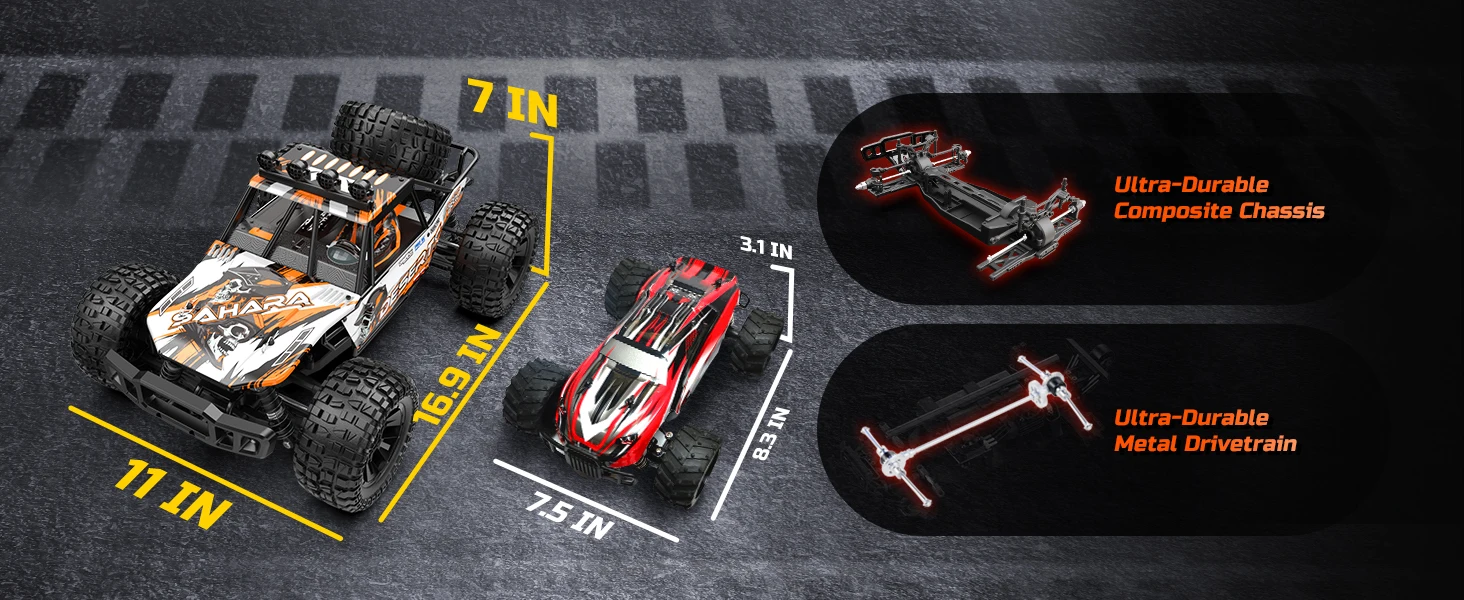 Unmatched Durability Upgrade - This RC car features a sturdy metal drivetrain with upgraded components like dog bones, a metal differential, and gears, ensuring exceptional durability and longevity. Its ultra-durable composite chassis can handle the toughest terrains, resist impacts, and minimize damage, offering 50% more durability compared to traditional models. This makes it the top choice for enthusiasts who demand quality and performance.