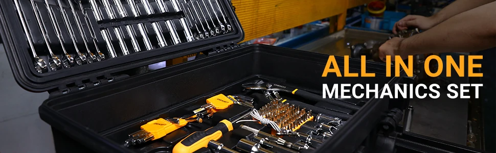 [SET INCLUDED] 72 teeth Ratchet Wrenches, Metric & SAE Sockets, Metric & SAE Deep Sockets, 3/8"E Sockets, 3/8" Spark Plug, Socket Bits, Extension Bars, Adaptors, Metric & SAE Hex Key set, CRV Bits, Bit Holder Metric & SAE Combination Wrench, Universal Joints, Metric & SAE Nut Drive set, 1/4" Coupler, 10" Dip Plastic Water Pump Pliers, Auto Voltage Tester and BMC.