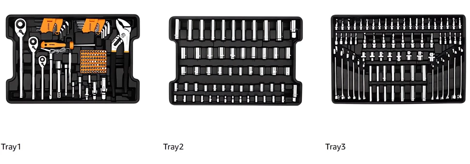 [UPGRADE DESIGN] The portable extra large capacity tool box is specially equipped with two trays to increase the number of tools, socket and wrench sets are placed in good organizer and storage, easy to carry and store. Made of high strength alloy material, durable and corrosion resistant.