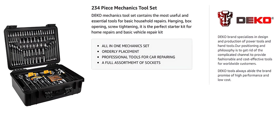 DEKO Mechanic Hand Tools Kit and Socket Sets 234Piece 1/2 1/4 3/8 Inch Ratchet Wrench Auto Tool Box Set for Car and Home Repair