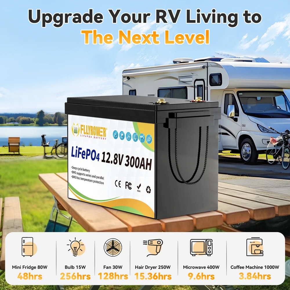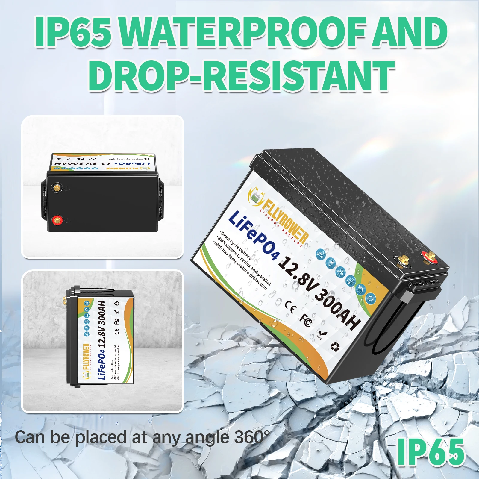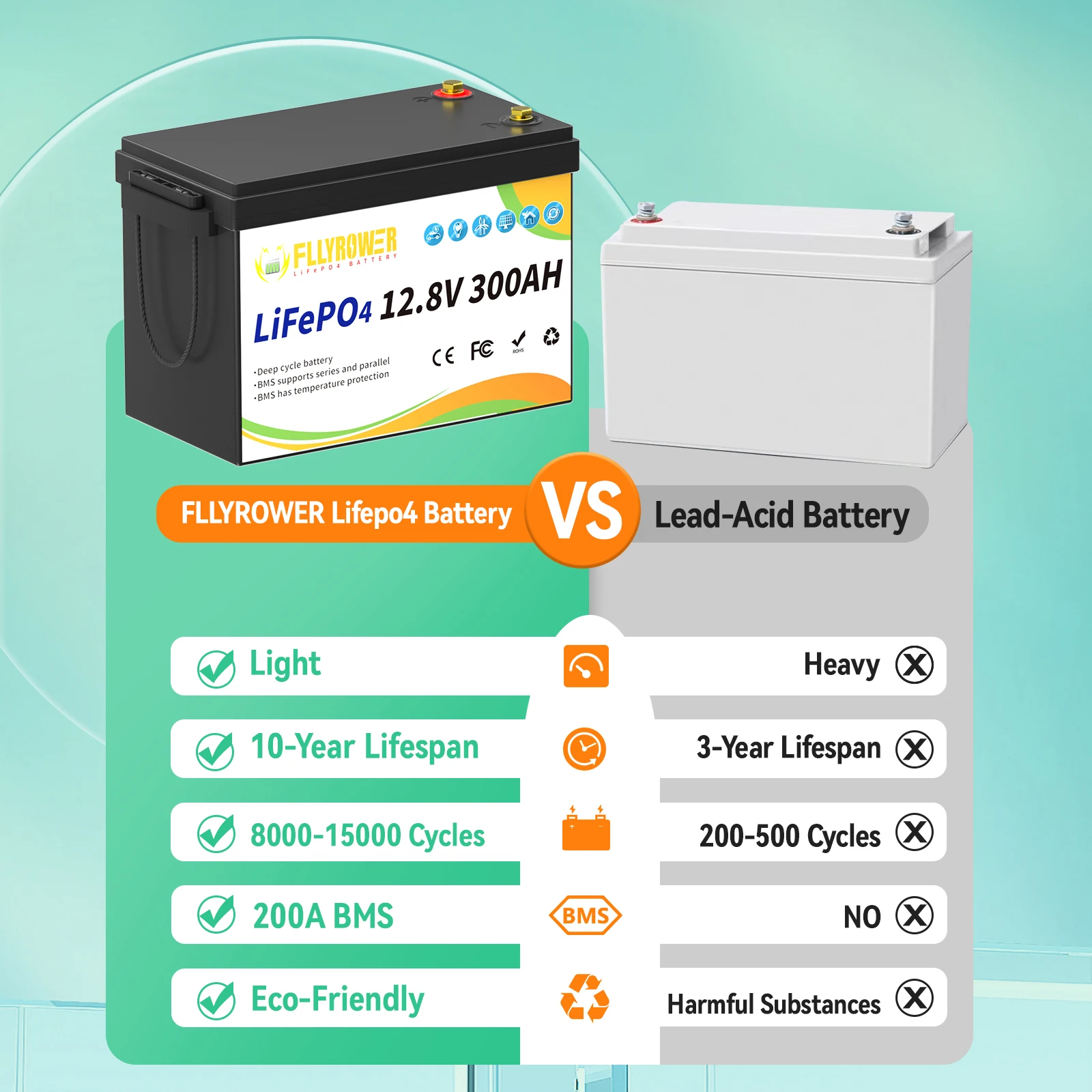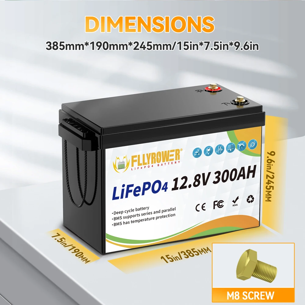 FLLYROWER 12V 300Ah LiFePO4 Lithium Battery Packs With 200A BMS LiFePO4 Battery For RV Boat Motor Solar Battery 8000+ Cycles