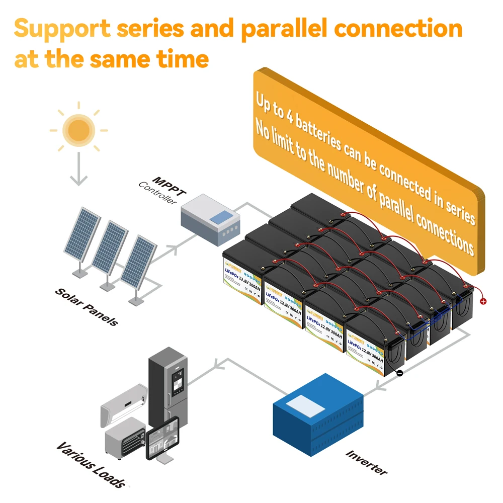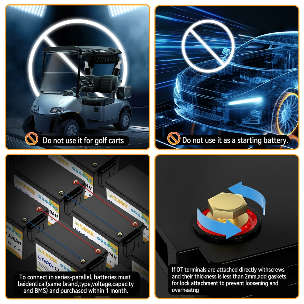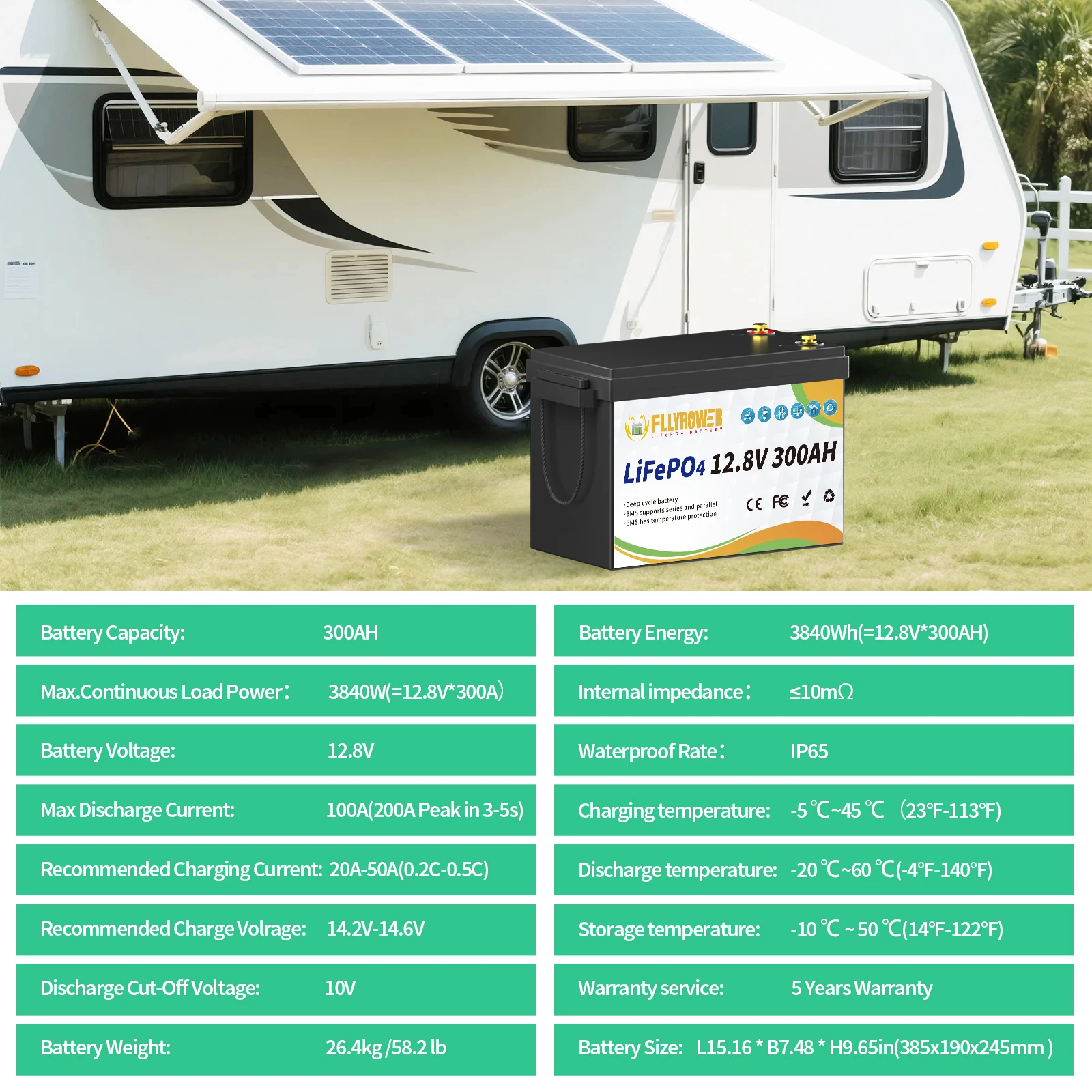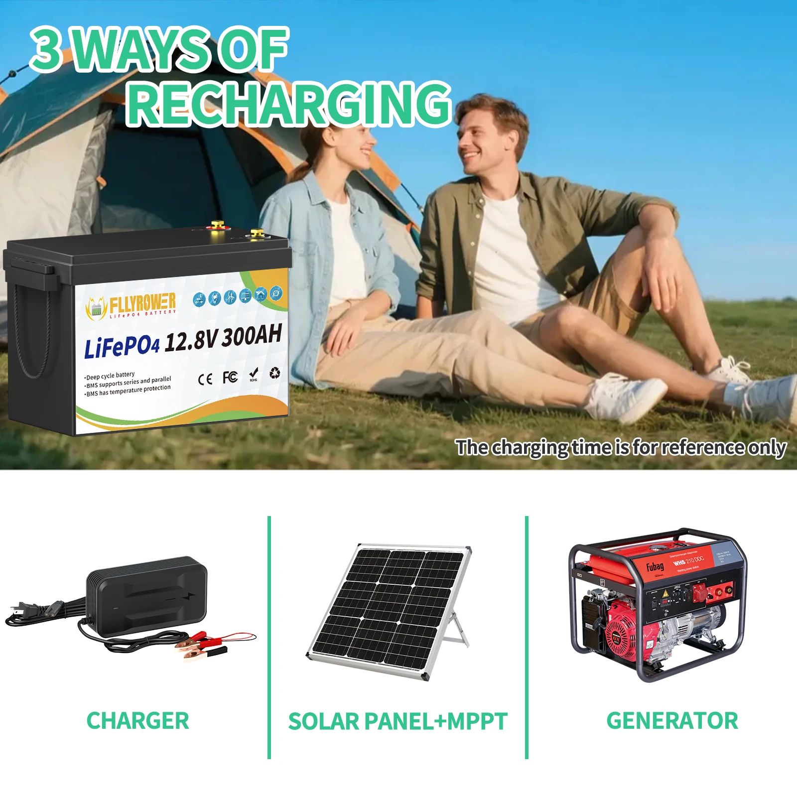 FLLYROWER 12V 300Ah LiFePO4 Lithium Battery Packs With 200A BMS LiFePO4 Battery For RV Boat Motor Solar Battery 8000+ Cycles