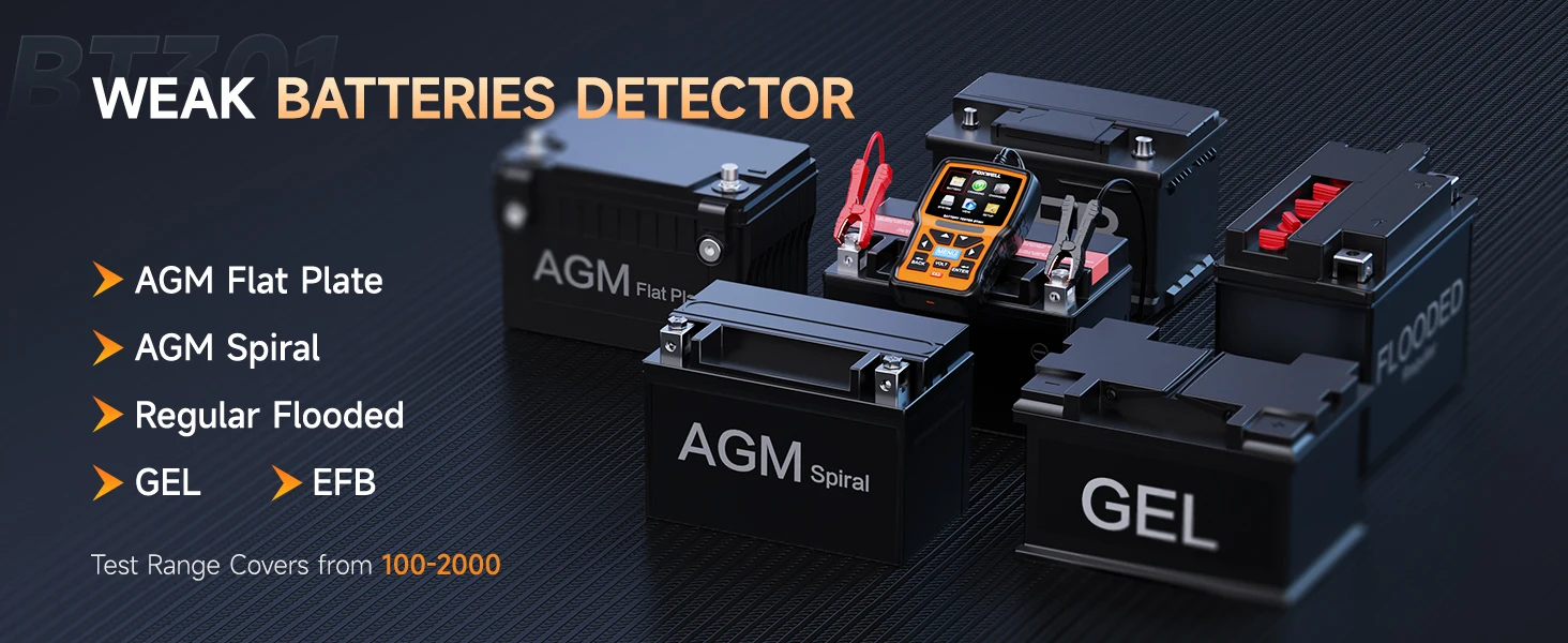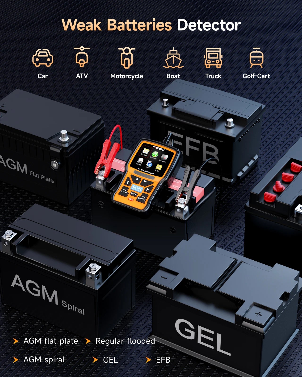 Told you What you Need - The clear display shows you the battery's condition and advises if any action is needed—ideal for avoiding unexpected stalls on the road. It tests 6V and 12V batteries, covering types like regular flooded, AGM flat plate/spiral, EFB, and GEL batteries. This automotive battery tester accurately measures SOH, starter state, cranking voltage, cranking time, CCA, SOC, alternator output, and no-load/loaded voltage.
