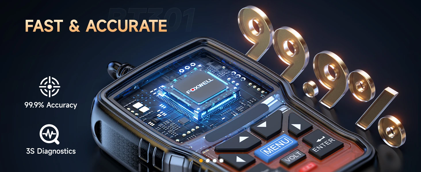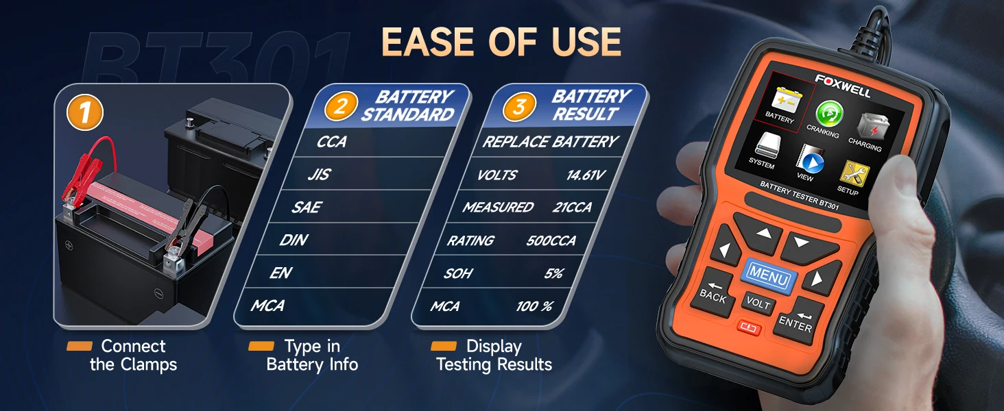 Enhanced Version of BT100, More features! - Enjoy a new UI design with a vibrant digital screen for easier readability. Get more functions to check car battery’s health, starter status, charging system, and alternator performance. With FOXWELL's premium chip, expect fast and 99.9% accurate results in seconds. The nearly 6.5ft cable of the battery tester 12v automotive allows easy testing both inside and outside the vehicle without assistance.