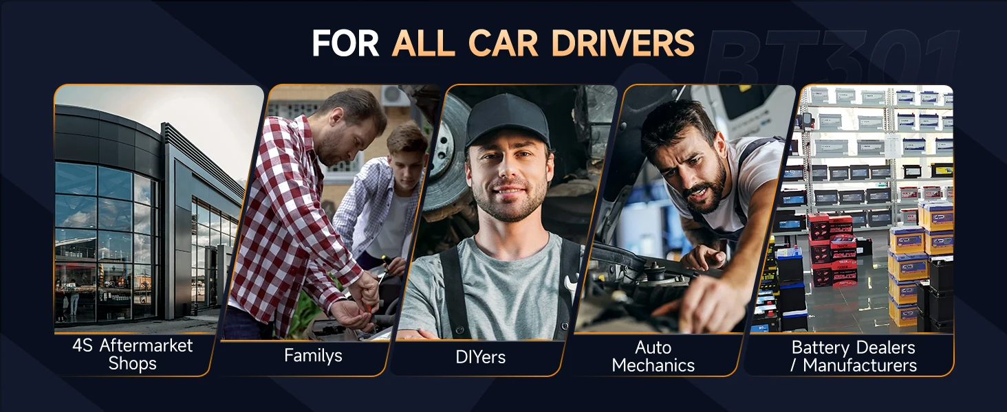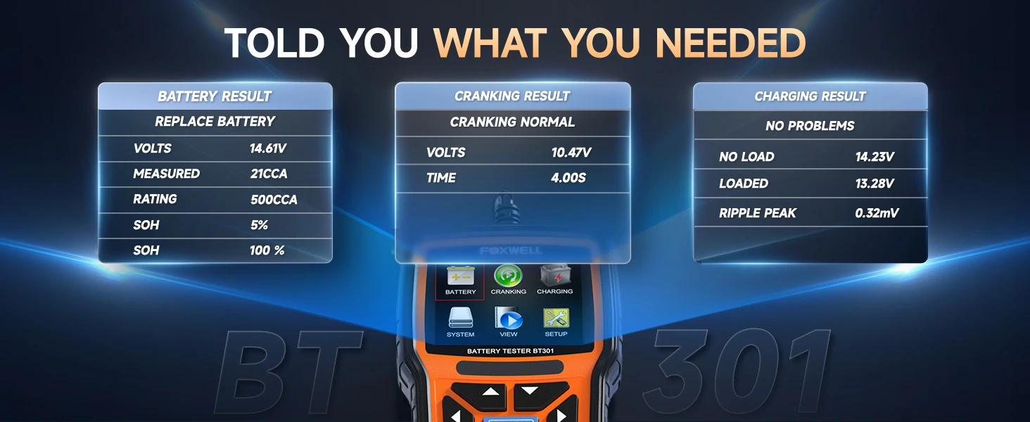Check the health of your battery charging system to prevent overcharging or incomplete charging, which can damage your battery. The tester indirectly evaluates the alternator's performance by analyzing battery voltage fluctuations. Note: The BT301 does not directly test the alternator.