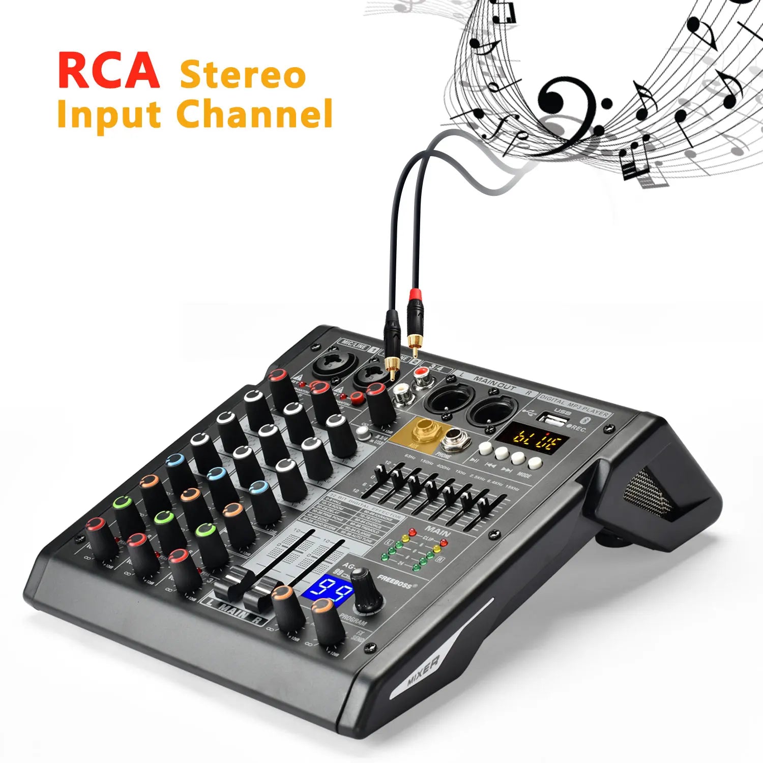 4 channel audio mixer 7 band stereo EQ 99 dsp effects bluetooth sound mixer separetely 48V phantom power USB PC recording playback mixing console for karaoke meeting home party radio.