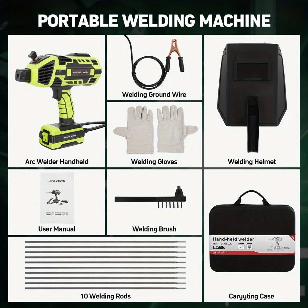 【Complete Welding Tool Kit】You will get 1 X Portable Welding Machine, 1 X Welding Ground Wire, 1 X Welding Helmet, 1 X Welding Brush, 1 X Carrying Case, 1 X Welding Gloves, 1 X User Manual, 10 X Welding Rods.