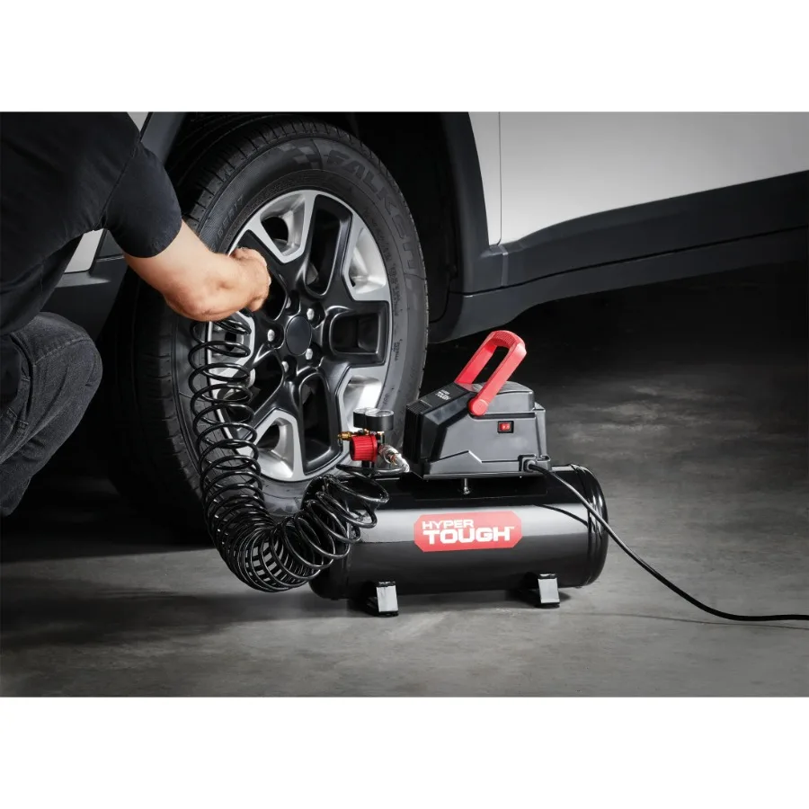 Pump up your car tires or a basket ball quickly and easily with the Hyper Tough 3-GAL Air Compressor. This device is your convenient everyday oil-free air compressor. It's designed for inflation, cleaning, stapling, nailing and hobby painting. The Hyper Tough 3-GAL air compressor features a quick connect coupler, two gauges and a large regulator knob for easy operation. Use the mounted flip-up handle to easily carry the device around and to store it. Suction cups foot mounts provide stability while the compressor is used. Thanks to its oil-free design, this air compressor needs less maintenance.