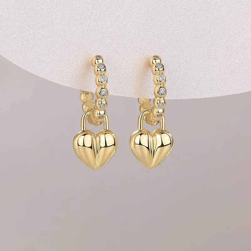 JIUZUAN 18K Gold Plated Heart Drop Earrings, 925 Silver with Moissanite, Beaded Hoop Design - Romantic Gift Jewelry for Women