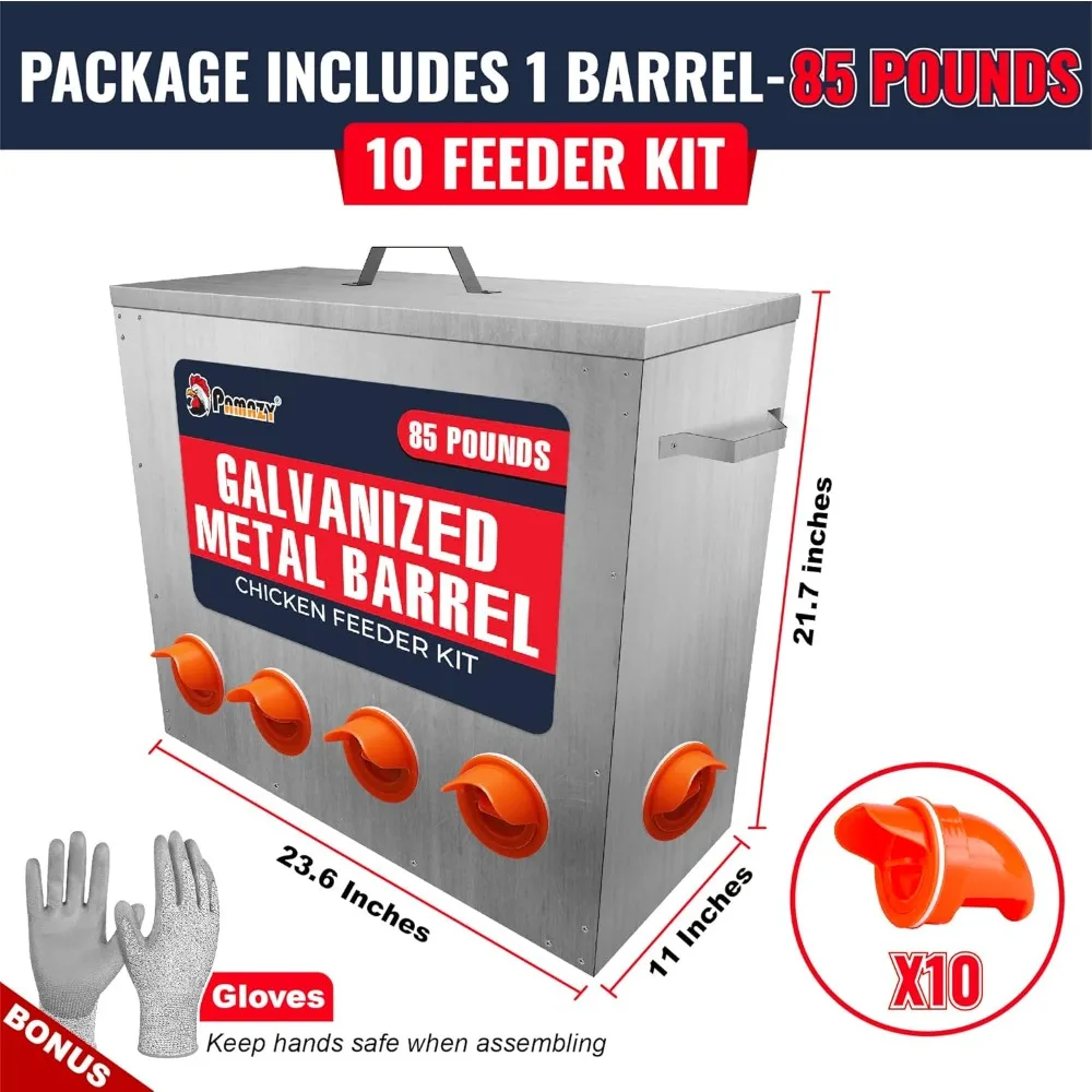 - [ Packing Information ] Our product is always produced with the high quality and checked carefully before packaging in the box. Packaging Includes: one 85 pounds metal barrel, 10 feeder ports & 1 glove. Easy to install with full accessories and accompanying instructions