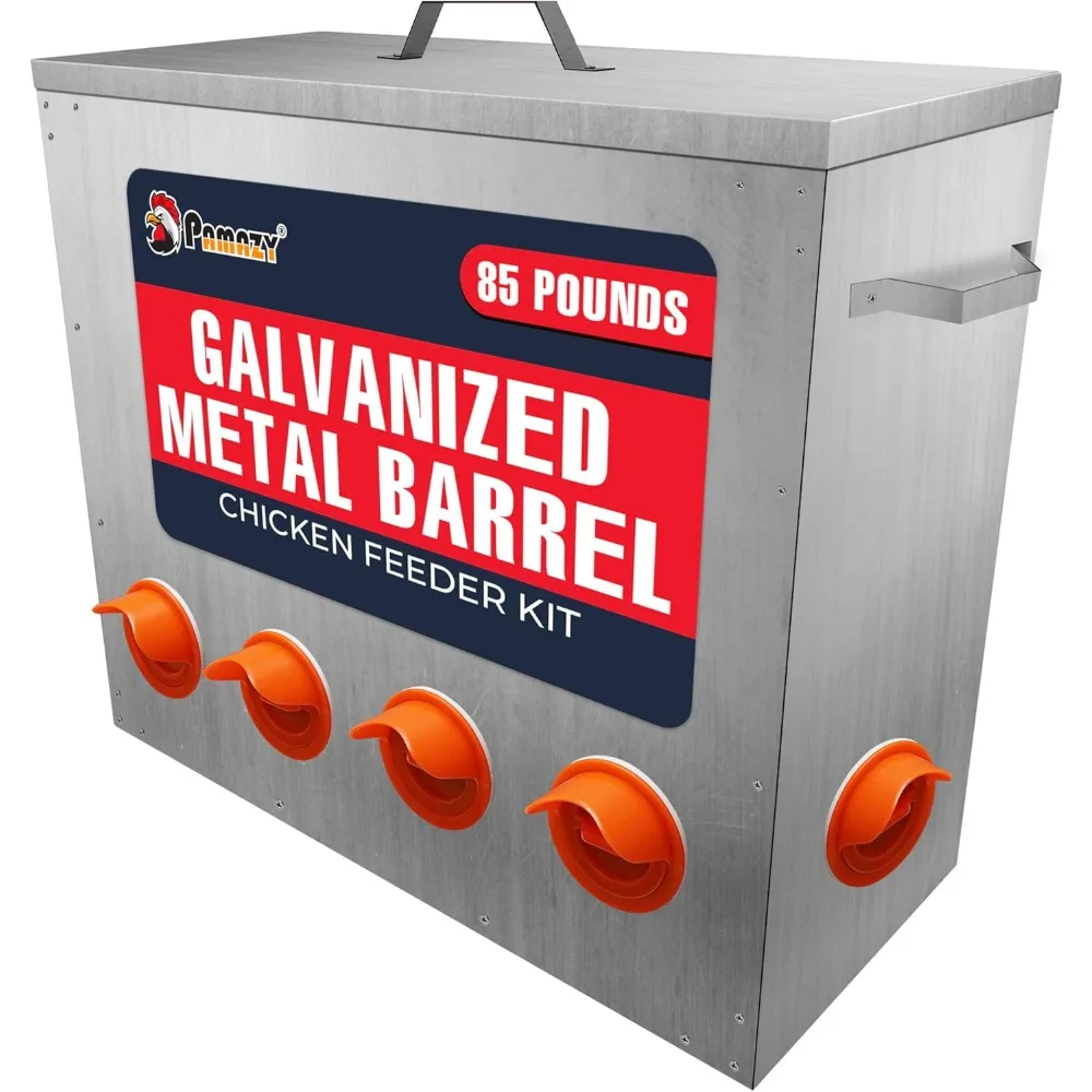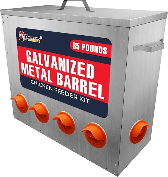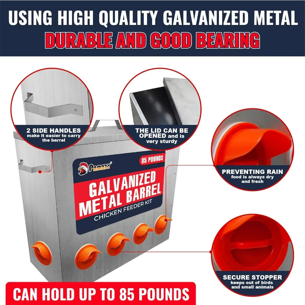 - [ High Quality Material & Durable ] The barrel made of premium galvanized metal, is odorless, and ensures safety for poultry health. With a barrel lid cover to protect food inside from rainy or sunny weather. The feeder ports are made of high quality PP plastic. Our products are enduring, have good heat resistance, and can withstand the pecking of chickens for a long time, even when you put them outdoors.