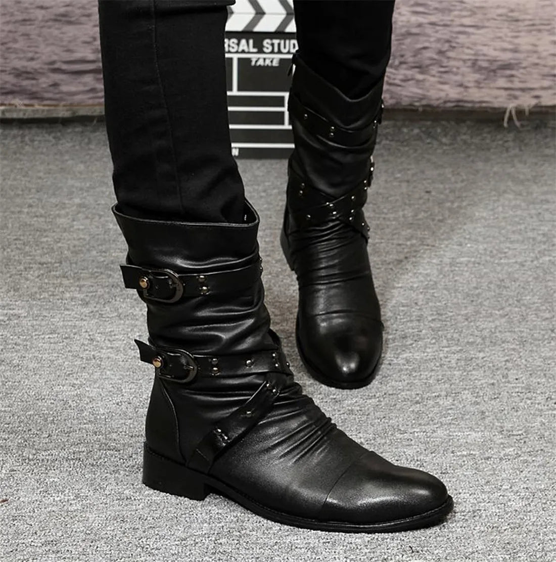 - Rugged mid-calf silhouette in faux leather with rivet accents delivers authentic motorcycle swagger and a bold punk-gothic look for your ensemble.