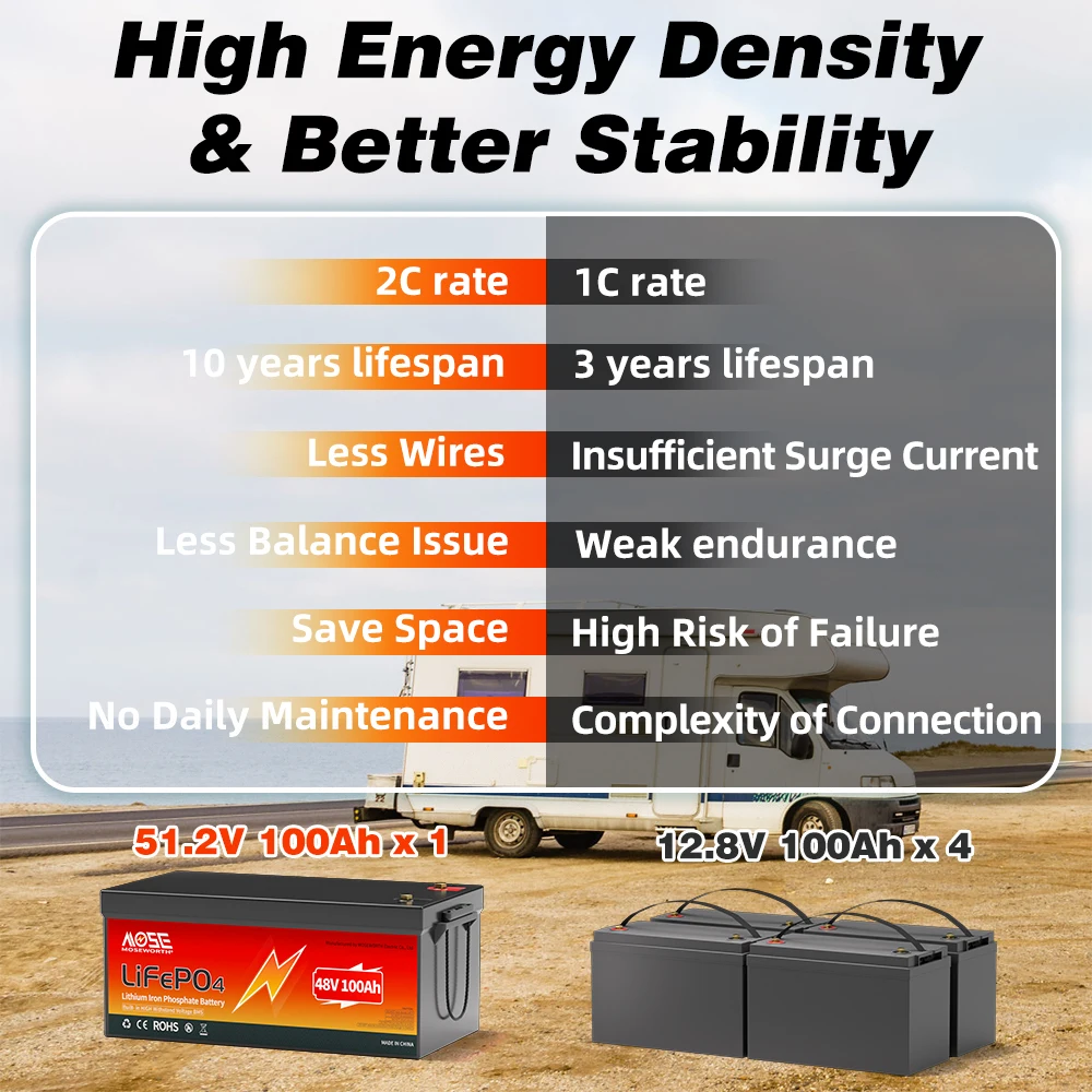 2. LIGHTWEIGHT AND VERSATILE - At the same capacity battery, MOSEWORTH's lifepo4 battery weighs only 1/3 of the lead-acid battery.With no acid in the battery, you're able to safely mount in any position. This makes li-ion batteries perfect for marine, RV, campers, golf cart, off-road and off-grid applications!