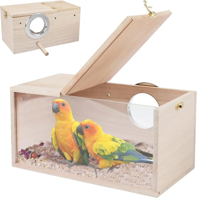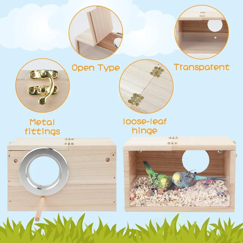 Parakeet Nesting Box - Transparent Design, Wooden Breeding House with Perch for Cockatiel, Lovebirds, Budgie, Finch, Parrotlets