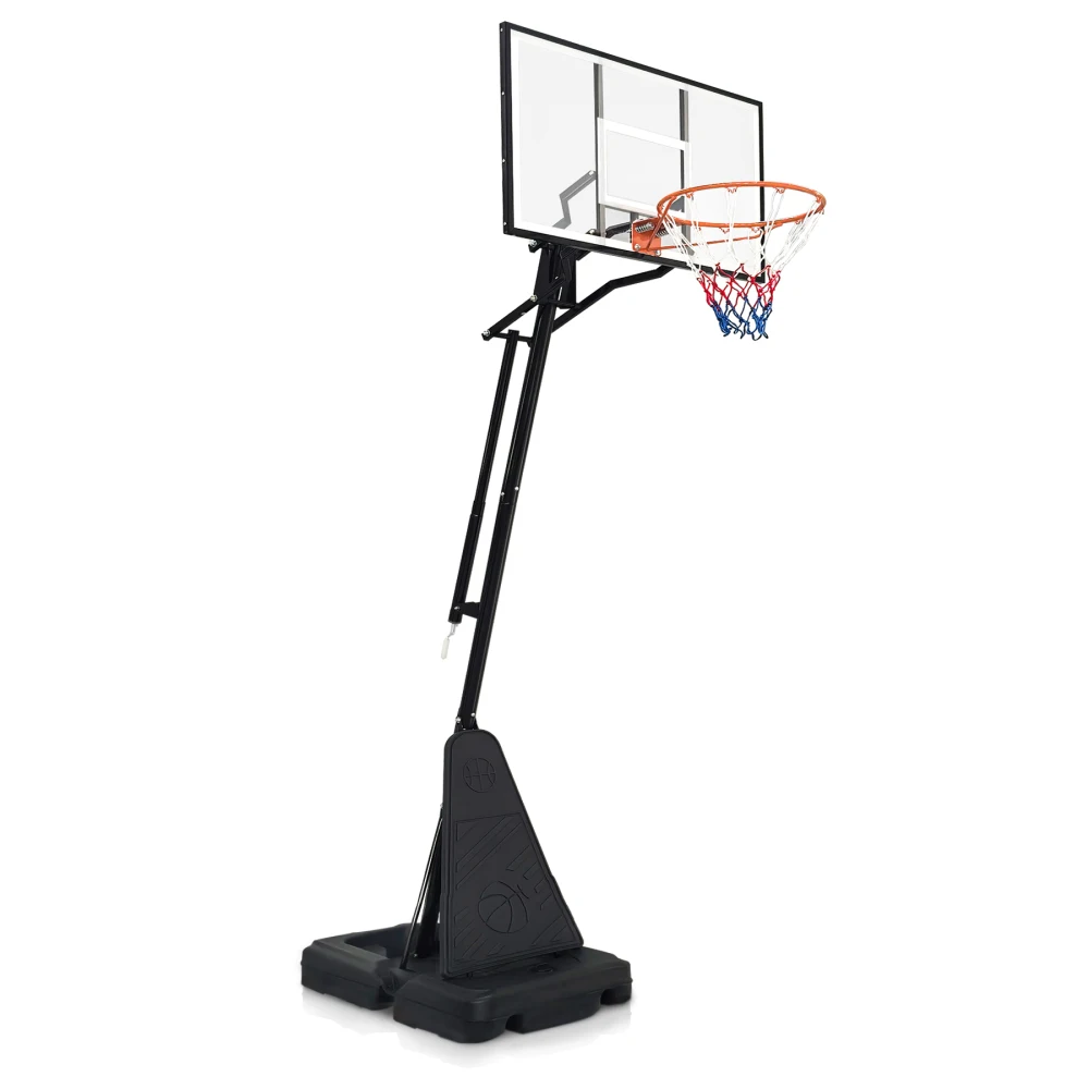High-quality materials: Profession Basketball system is constructed of heavy-duty steel, durable polycarbonate backboard, and an all-weather nylon net. This basketball hoop is designed to last through many basketball seasons, and the transparent shatterproof polycarbonate backboard, enough to handle the most intense competition and bad weather - Stable base: The mobile base can be filled with water or sand to ensure your safety and stability when shooting the basket. Two built-in wheels provide convenience for transportation and movement