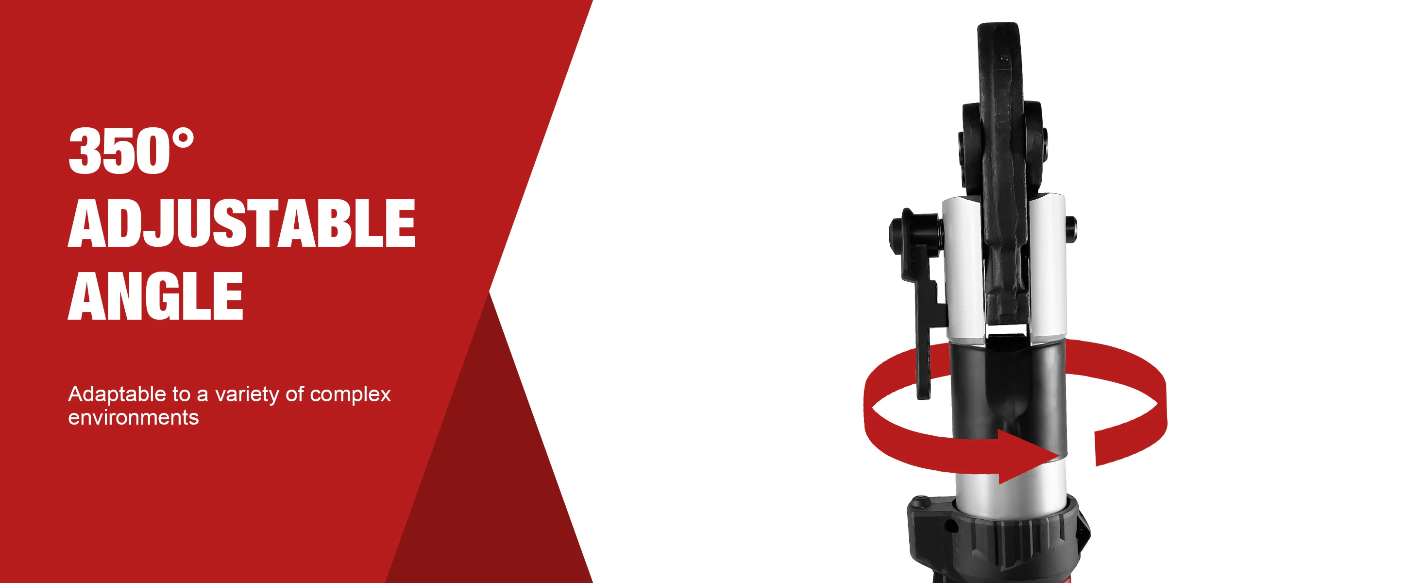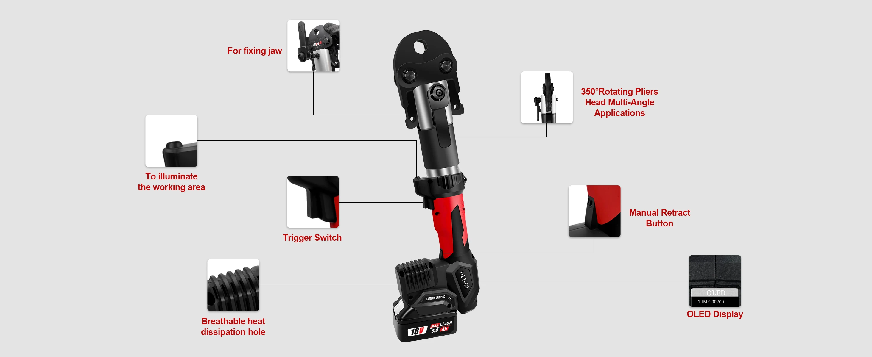 【Easy and Safe to Use】This battery-powered propress tool features a temperature sensor and ventilation slots for heat dissipation, ensuring machine safety. With 360° swiveling jaws and LED lights, it adapts to complex environments and low-light conditions