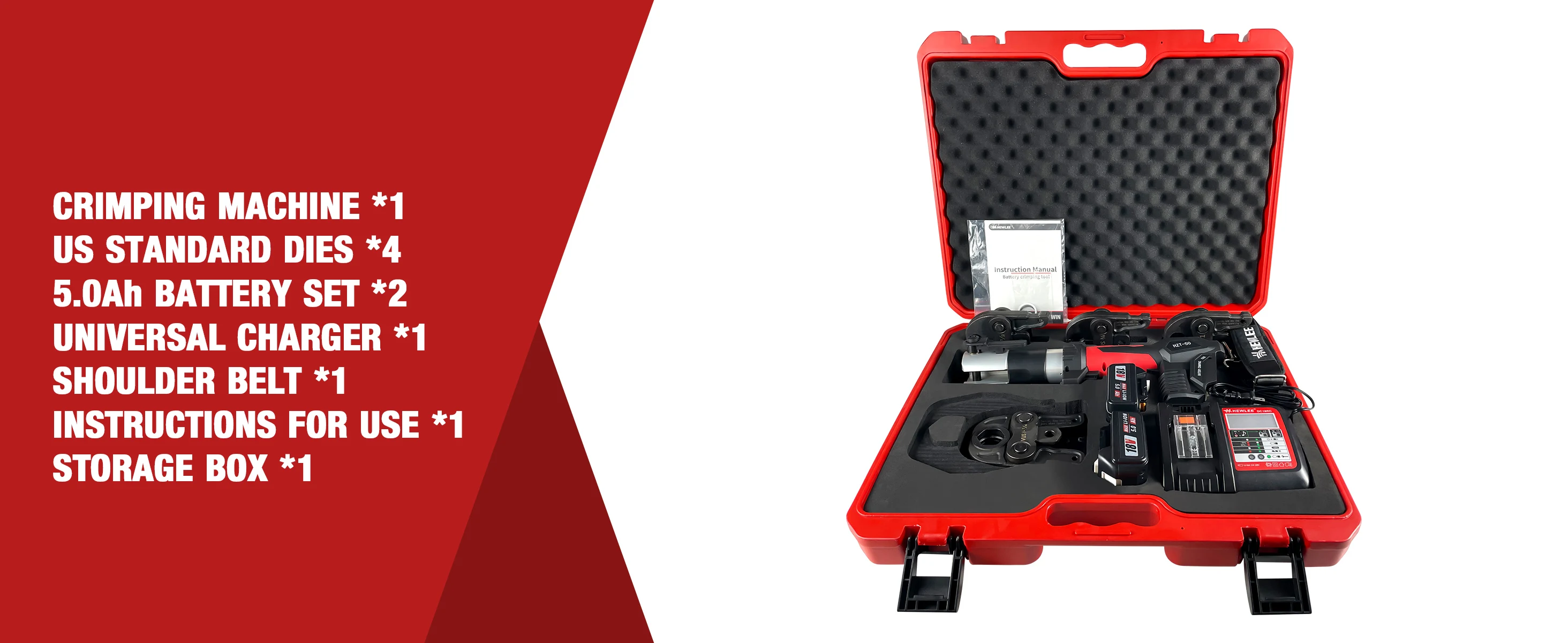 【2025 Newest Contains】Professional copper pipe press tool kit includes: Upright Propress Copper Crimper*1, US Standard Dies*4 (1/2", 3/4", 1",1-1/4"), 18V 5.0Ah Li-ion Battery*2, Universal Charger*1, Storage Box*1, Instructions*1