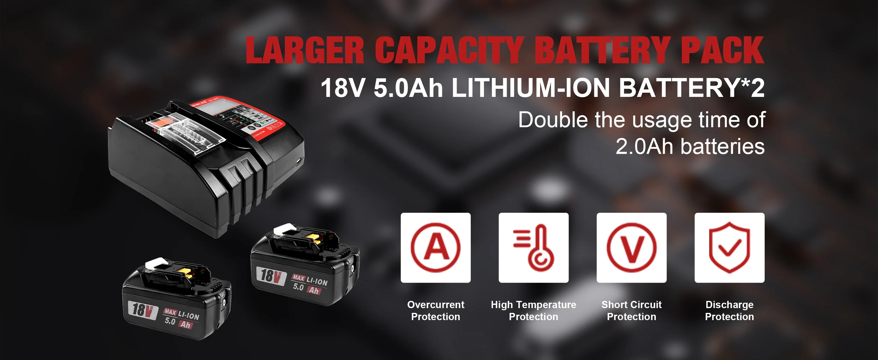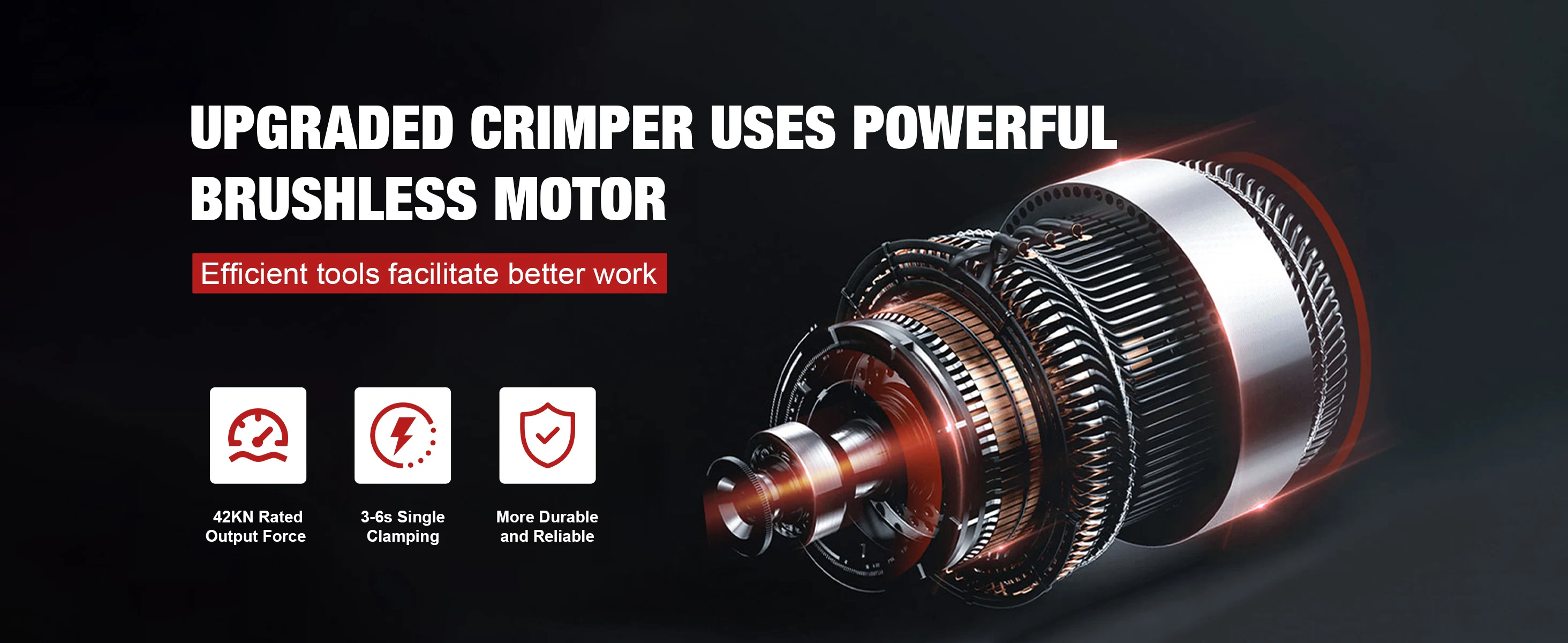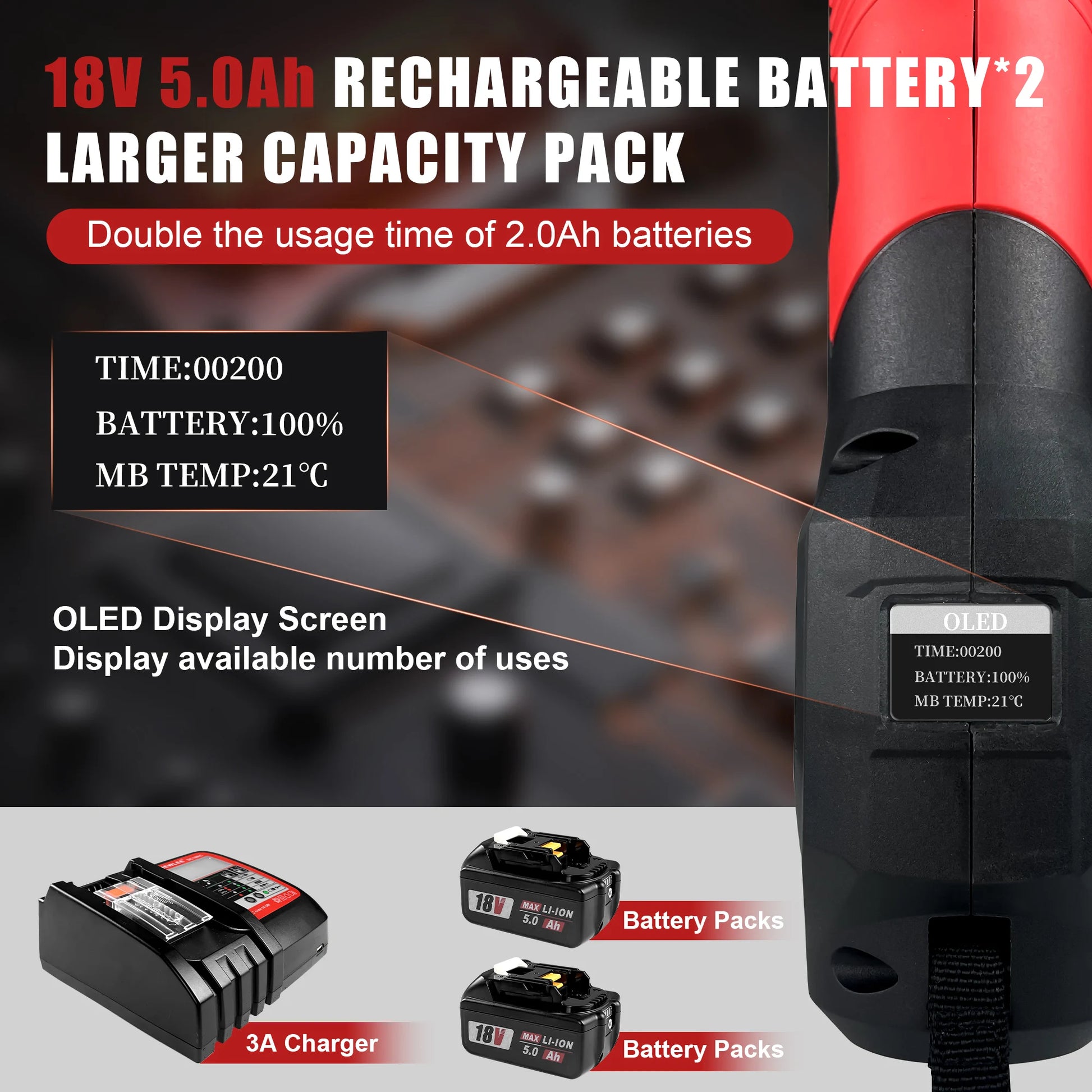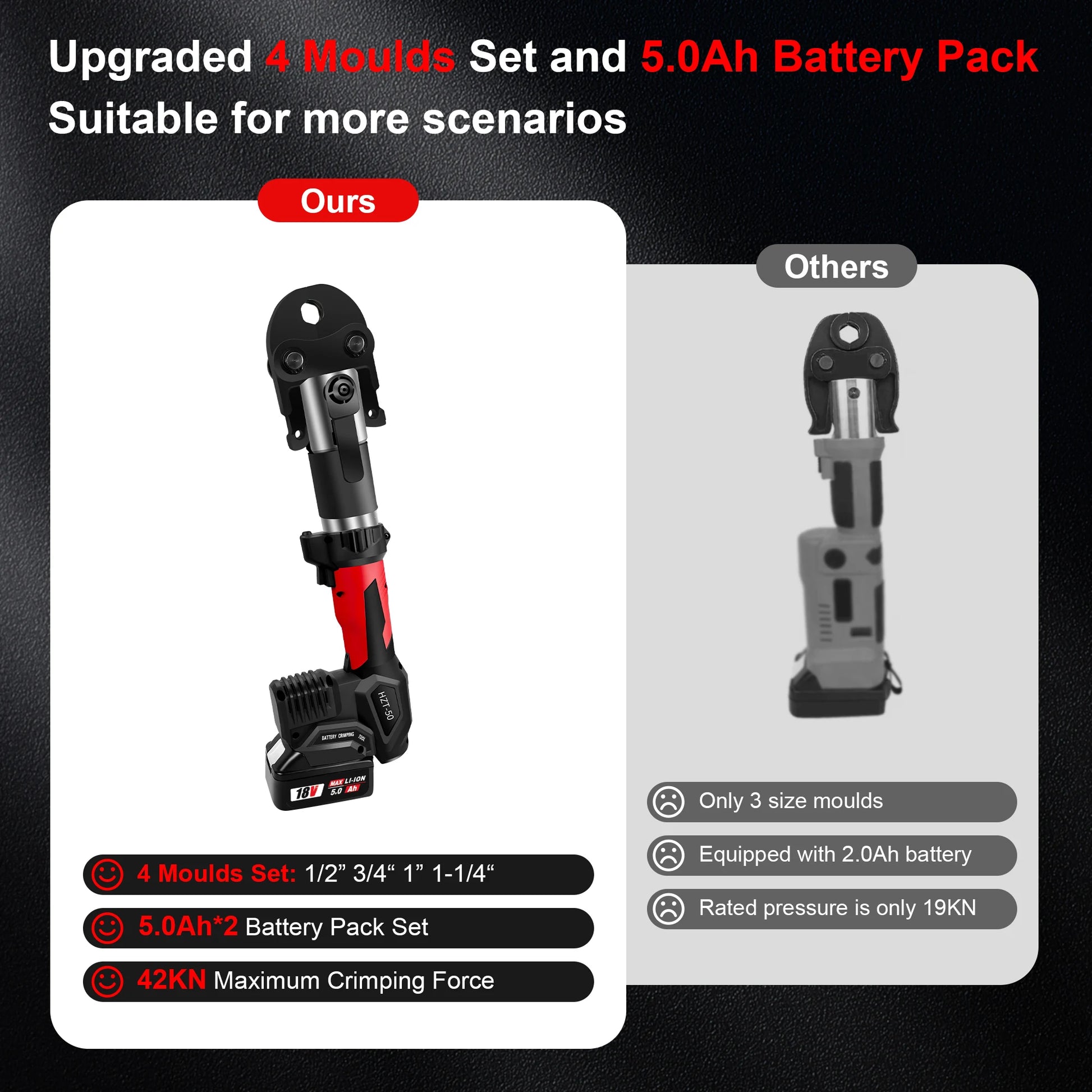 【5.0Ah Higher Capacity】The electric propress crimper is equipped with 5.0Ah capacity batteries*2, which can be continuously crimped more than 400 times, and the running time is 200% more than that of 2.0Ah batteries, 25% more than that of 4.0Ah batteries