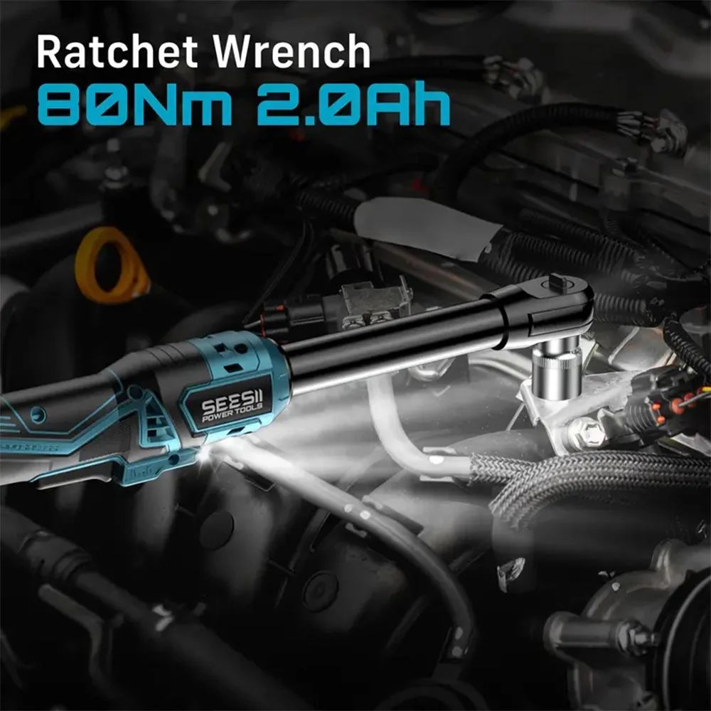 Seesii 3/8" 21V Cordless Electric Wrench 80Nm 6.3'' Extended Electric Ratchet Wrench Rechargeable Angle Wrench Car Repair Tools