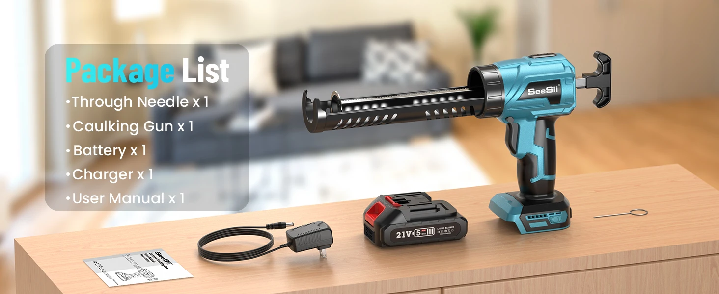 ACCESSORIES & 24×7 SUPPORT: The caulking tool gun includes - Electric caulking gun x 1, chargeable Li-ion battery x 1, charger x 1, User manual x 1.