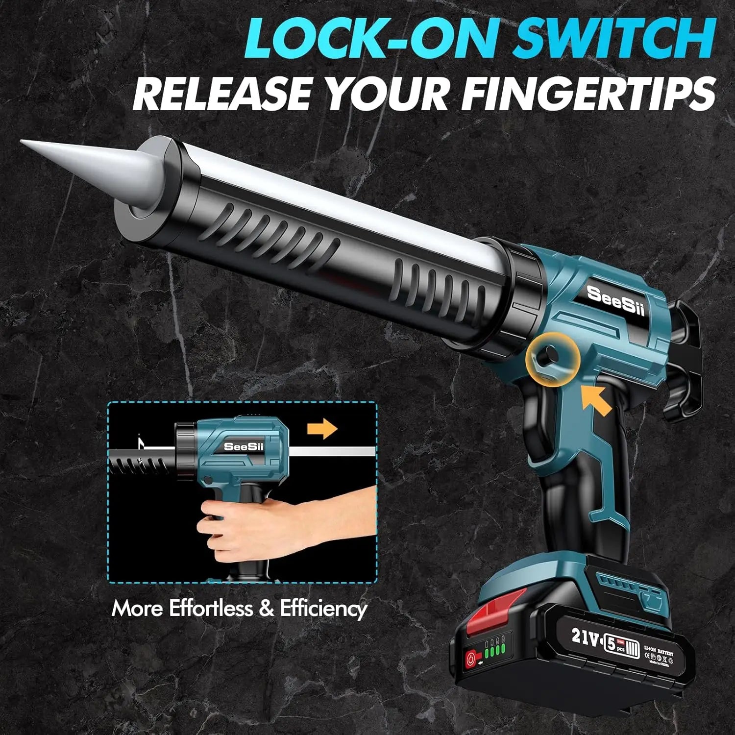 Seesii Cordless Caulking Gun, 21V Battery Powered Caulk Gun, Electric Caulking Gun w/1 Battery, 4 Speeds, 10oz/300ml No Drip Caulking Gun for Filling, Sealing