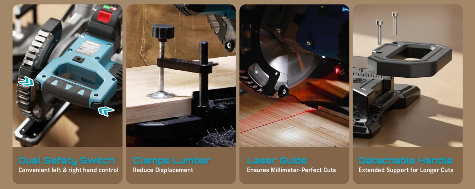 Dual-Switch Safety & Dust Collection: This battery powered miter saw features dual-hand start with trigger lock for accident-proof operation, plus an ambidextrous ergonomic design for comfortable control, while the built-in dust port connects to vacuum bags to minimize airborne sawdust—ensuring safer, cleaner cuts every time.