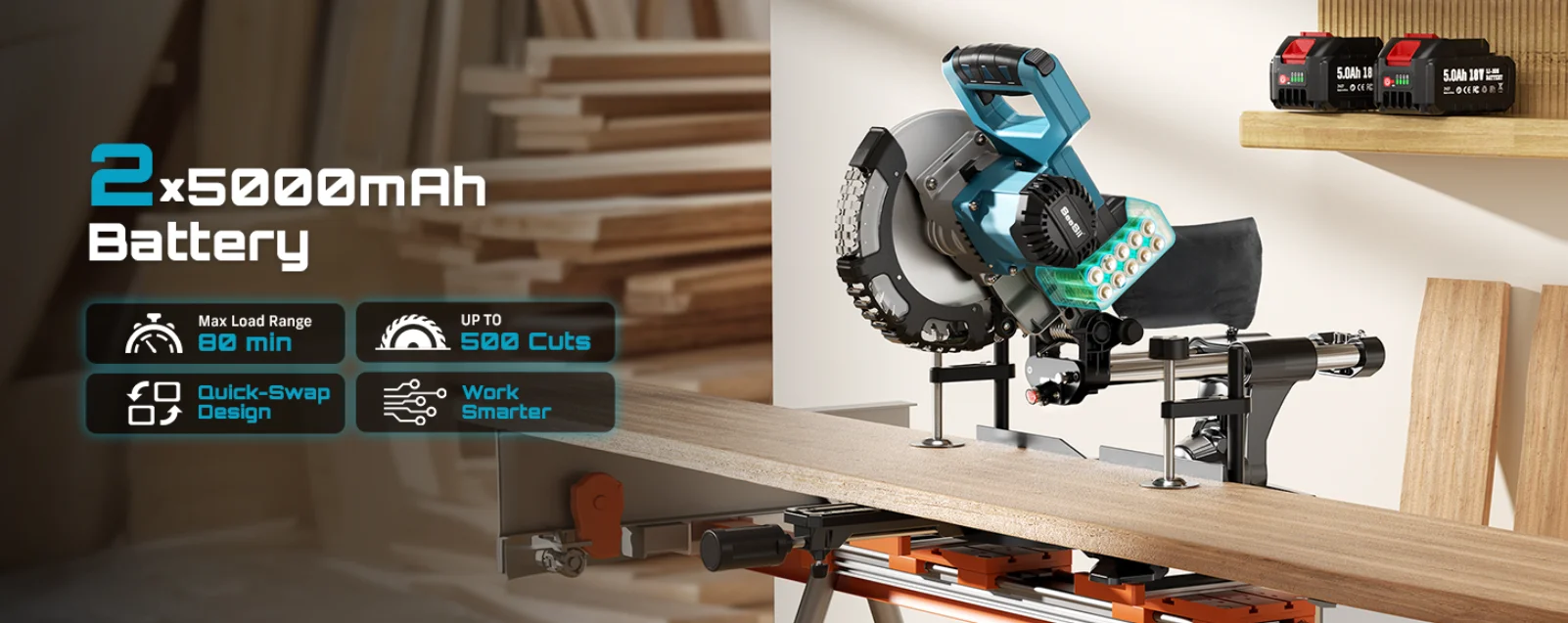High-Capacity Dual Battery System: This cordless compound miter saw comes with two high-capacity 5000mAh battery packs featuring high-rate brushless motor for long-lasting power, while the quick-swap design ensures uninterrupted operation and maximized productivity.