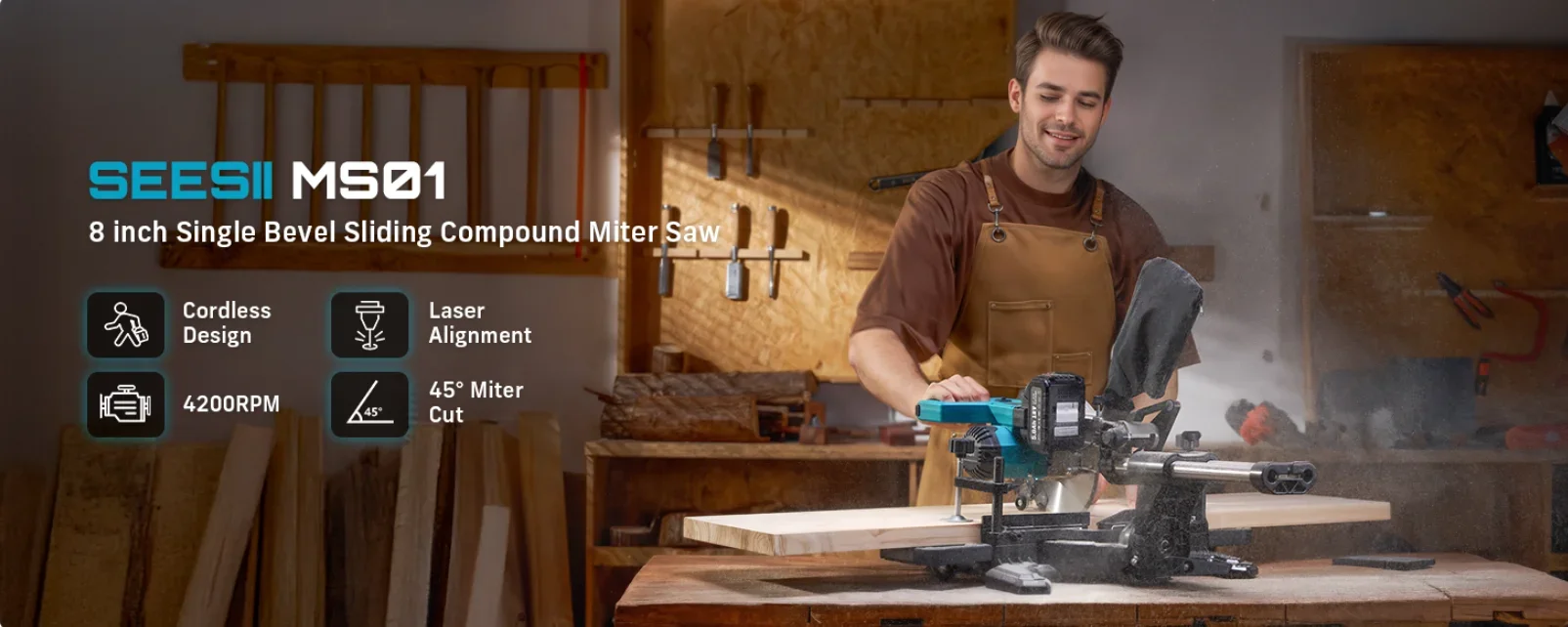 SEESII Sliding Compound Miter Saw: Cordless Power Miter Saw with Laser Guide 8-Inch, 2 * 5000 mAh Batteries, Single Bevel 45°, 24T TCT Blade, Max Cut 2.5×12-inch, Ideal for DIY & Woodworking