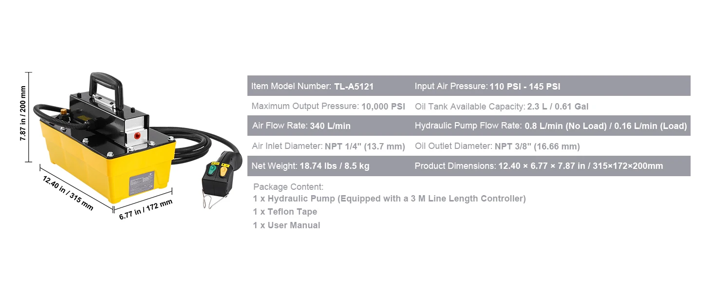 Standard Size for Easy Setup: With an air inlet of NPT 1/4 in and a high-pressure output of NPT 3/8 in, this air hydraulic pump is compatible with standard pneumatic accessories. It easily connects to your existing pneumatic system for hassle-free integration.