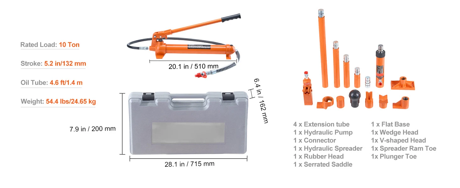 Carrying Case: The whole hydraulic jack body tool kit is compact and complete for the best working performance. The portable case is included for easy storage. You can carry the tool kit more easily.