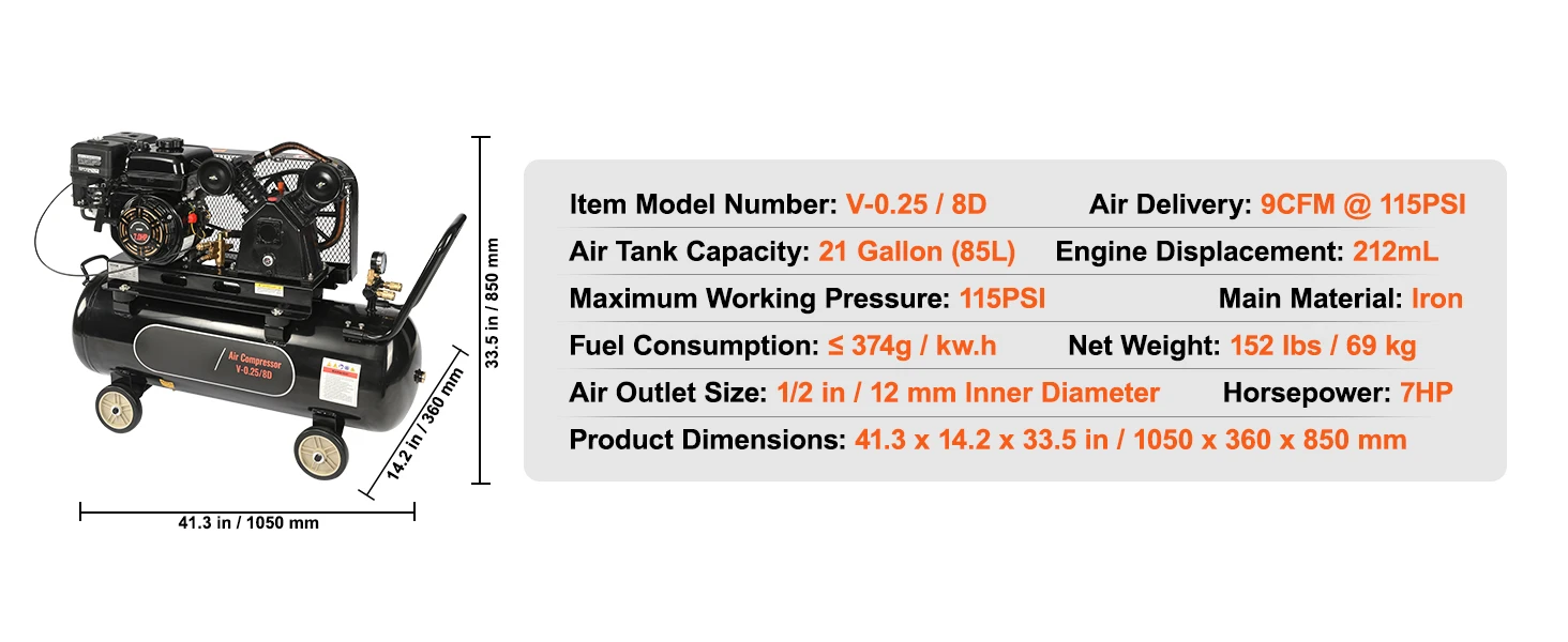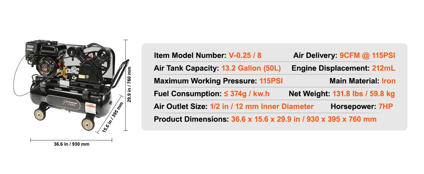 Horsepower: 15HP, Air Tank Capacity: 115L / 30 Gallon, Maximum Working Pressure: 115PSI, Air Delivery: 33CFM @ 115PSI, Engine Displacement: 212mL, Fuel Consumption: ≤374g/kw.h, Main Material: Iron, Net Weight: 123 kg / 271 lbs, Air Outlet Size: 12 mm Inner Diameter / 1/2 in, Product Dimensions: 1240 x 450 x 970 mm / 48.8 x 17.7 x 38.2 in, Item Model Number: W-0.9/8.