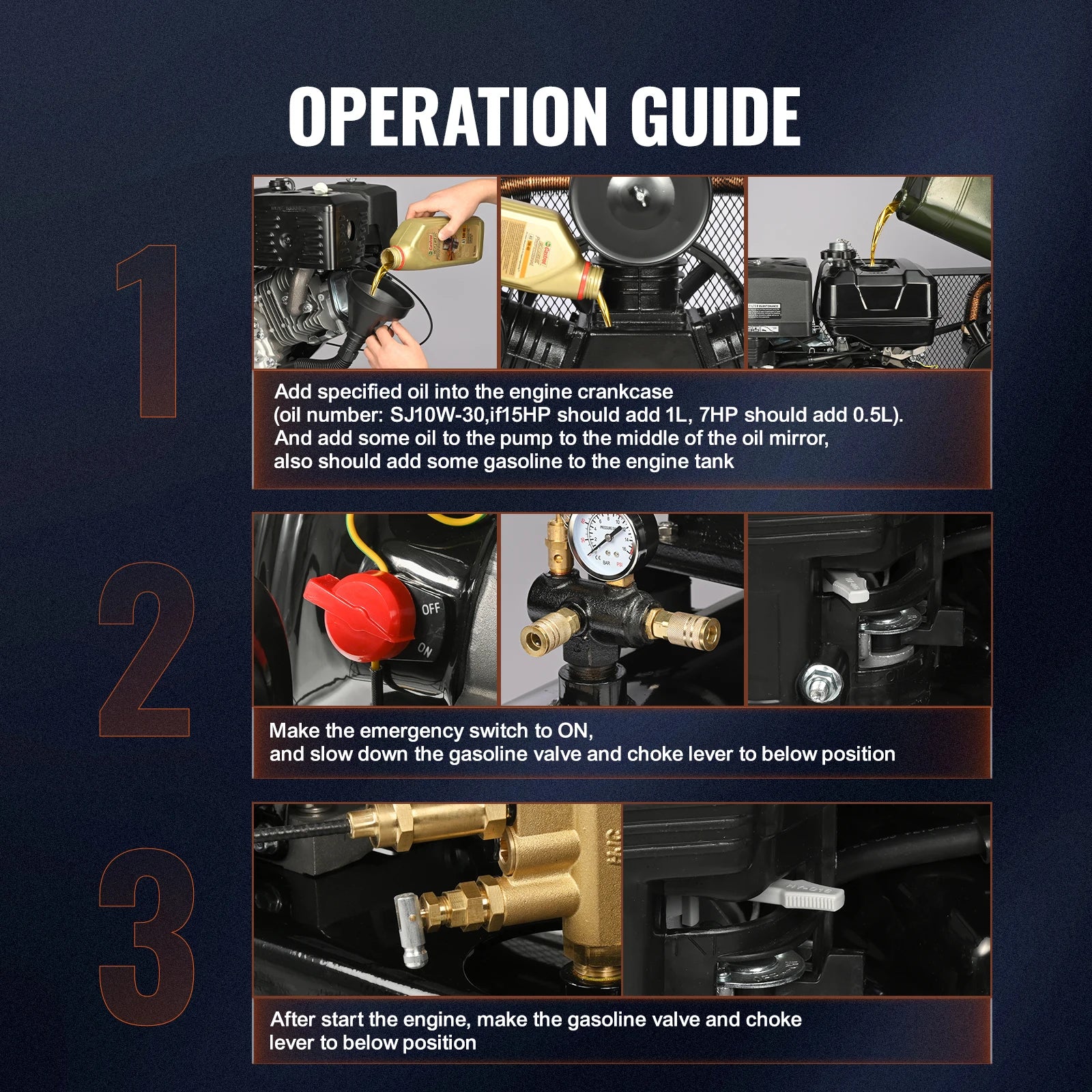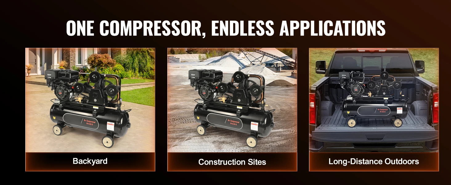 Easy Mobility: The 4 smooth rolling wheels make it simple to move the piston pump air compressor to wherever you need it. Ideal for outdoor and long-distance projects, it's easily transportable for on-the-go tasks. High Capacity and Performance: The SucceBuy 15HP gas powered air compressor has a powerful piston pump and delivers an impressive 33CFM@115PSI of air. It allows for fast inflation in just 2 minutes, uses less fuel, and has lower emissions. The 30-gallon tank and 2 air outlets ensure stable and simultaneous use. Stable Air Supply: The 30-gallon large capacity tank provides a long-lasting and stable air supply. It reduces the need for frequent starts and stops, guaranteeing your projects proceed smoothly from beginning to end. Versatile Application: Our gas powered air compressor is compatible with numerous pneumatic and air tools like nail guns, air sanders, impact wrenches, and spray guns. It's ideal for various fields such as chemical, light industry, food processing, and construction, ready to handle a wide range of tasks. Durable and Secure: Made with durable cast iron cylinders and frames, this gas driven air compressor is stable and long-lasting, resistant to wear and deformation. It also automatically shuts off when oil levels are low to protect the pump.