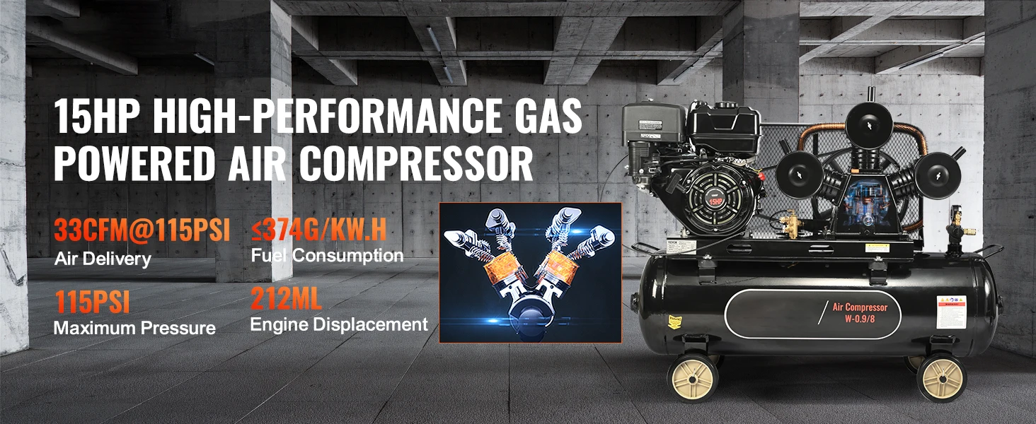 Experience the power and flexibility of the SucceBuy 30 Gallon Gas Powered Air Compressor; With an impressive 15HP high horsepower and 33CFM@115PSI air delivery, it provides rapid and efficient inflation in just 2 minutes; Enhance air compression while maximizing fuel efficiency and reducing emissions.