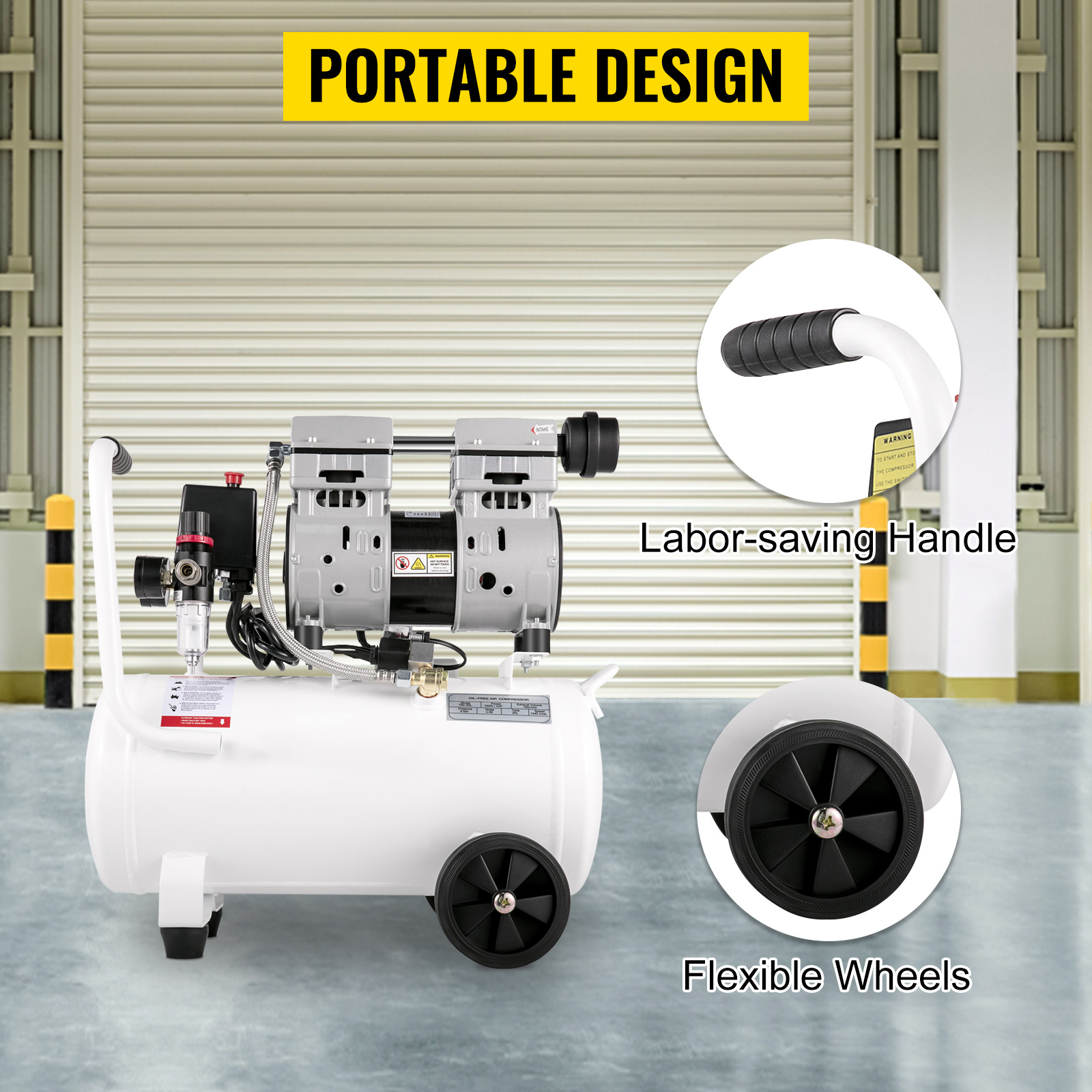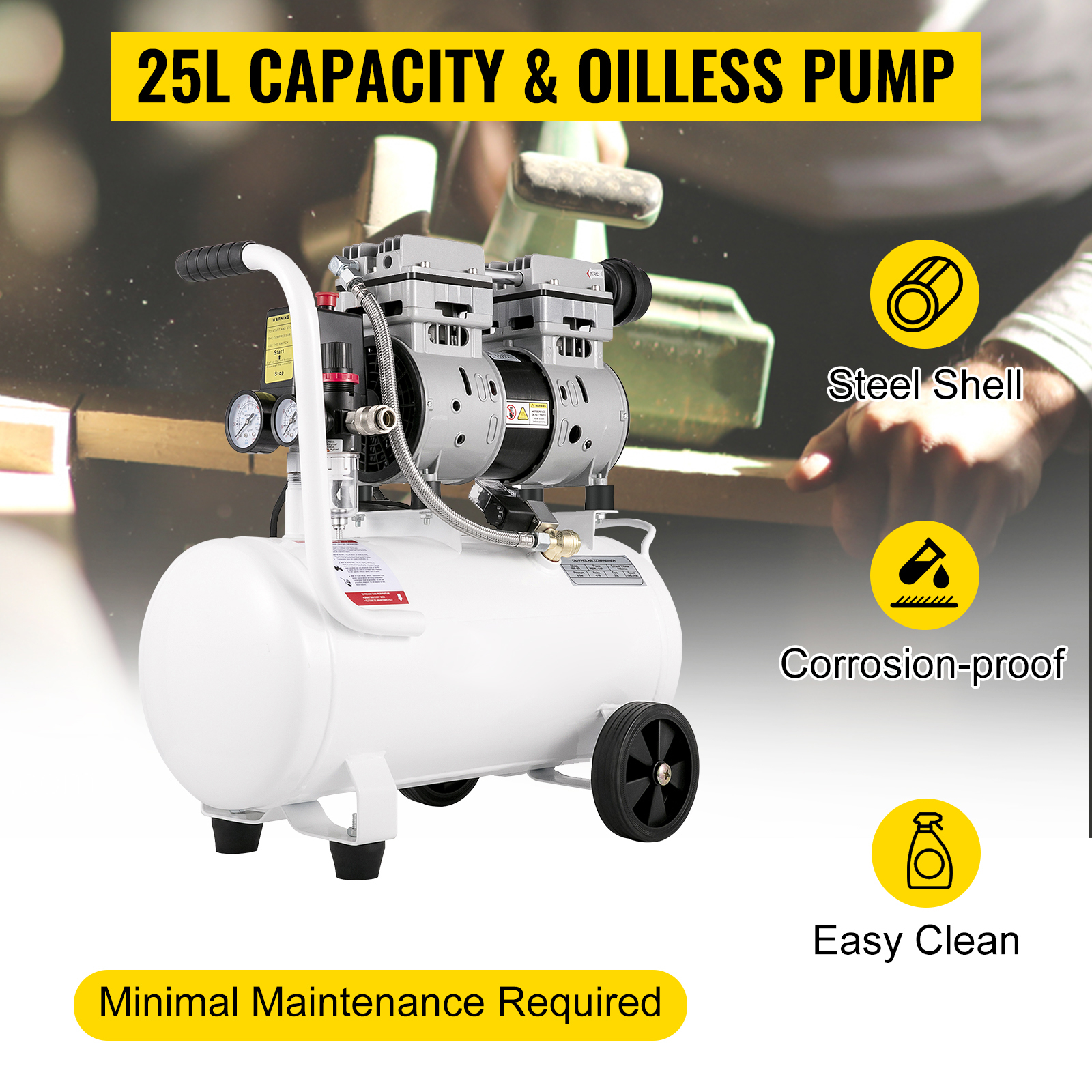 Powerful Performance: Equipped with a 6.6-gallon capacity and an oilless pump, this air compressor ensures minimal maintenance and continuous high-efficiency operation with its 25L tank.